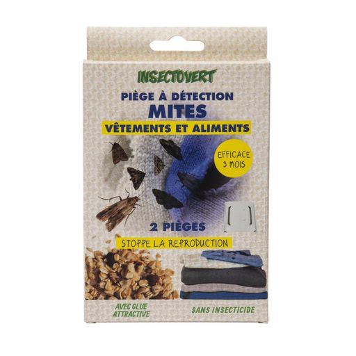 Description détaillée du piège à détection mites vestimentaires et alimentaires Utilisation domestique Marque Insectovert par SubitoPiège de détection pour mîtesSpécial vêtements et aliments Lot de 2 pièges Efficacité du piège: 3 mois1 piège protège jusqu'à 100m²Piège avec Glue attractiveSans insect