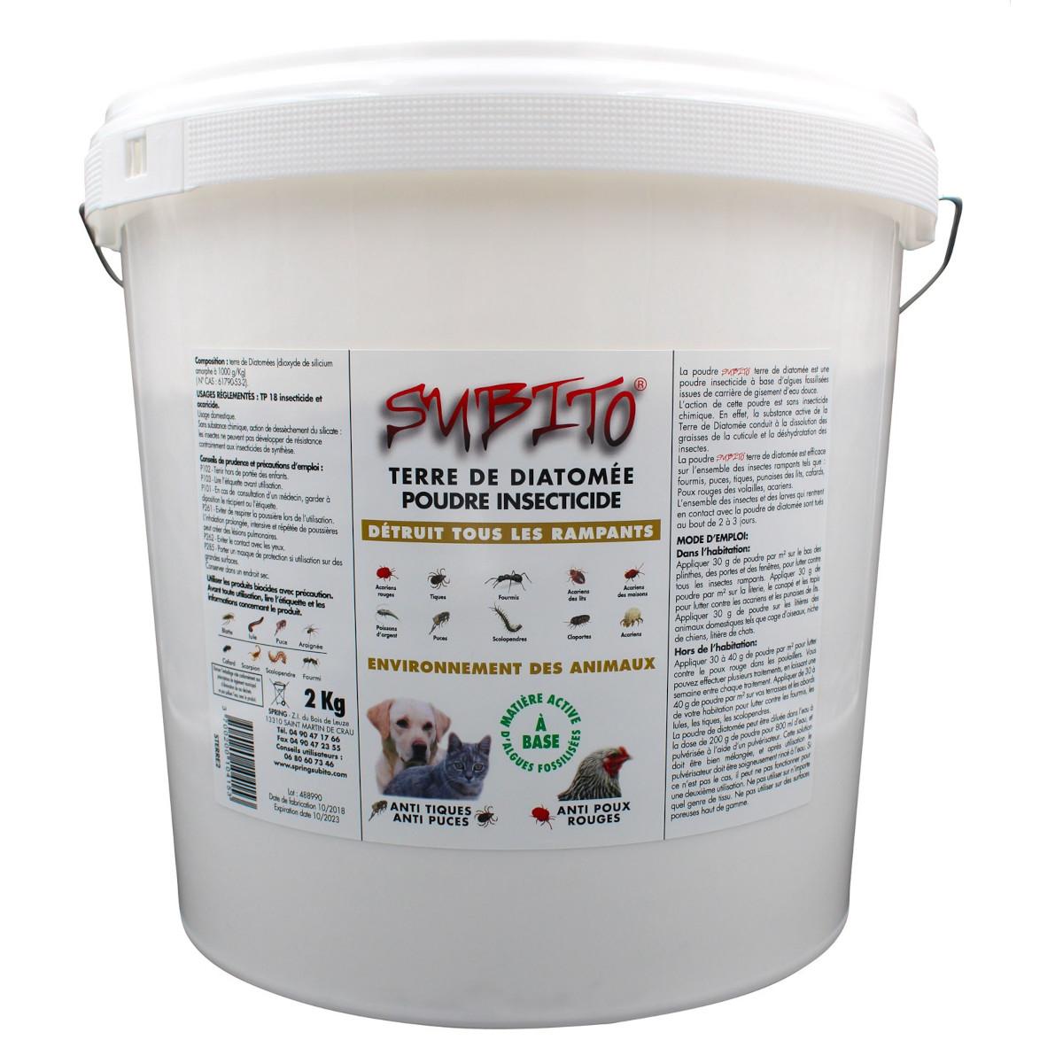 Subito STERRE2 La poudre insecticide terre de diatomée est une poudre à base d'algues fossilisées issues de carrière de gisement d'eau douce.L'action de cette poudre est sans insecticide chimique. En effet, la substance active de la Terre de Diatomée conduit à la dissolution des graisses de la cutic