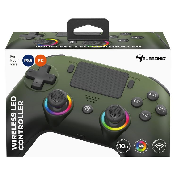 La manette PS5 verte de Subsonic est équipée de LEDs RGB programmables de 8 couleurs et 2 modes d&rsquo,éclairage, lui donnant ainsi un vrai look gamer.