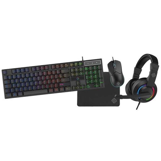 Pack complet d accessoires gamer 4 en 1. Le pack comprend : 1 clavier à Leds RGB, une souris gaming, 1 tapis de souris et 1 casque gamer rétroéclairage LED.Clavier gamer AZERTY à rétro-éclairage RGB, 104 touches, 460 x 192 x 27 mms.Souris optique gaming 3200 DPI, rétro-éclairage RGB, 7 boutons, 134,5 x 87,8 x 40 mms, 125 g, fil de 1,5 mètres.Casque gamer, Stéréo, haut-parleurs de 40 mms, micro inclinable, arceaux ajustables, télécommande pour le volume et la fonction mute . Prise jack 3.5 mms.Tapis de souris gaming, surface optimisée pour les déplacements rapides, revêtement antiglisse, 250 x 210 x 3 mms. Finition soignée avec couture sur les bords.