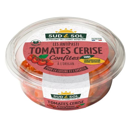 Ingrédients : Tomates cerise confites 97% (tomates cerise mi-séchées 88%, huile de colza 9%), sel, huile de colza, ail, origan 0.2%, acidifiant : acide citrique, conservateur : acide sorbique
