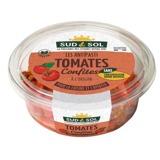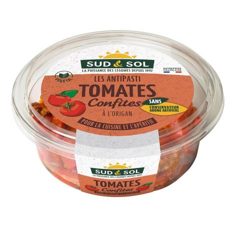 Ingrédients : Tomates confites 97% (tomates mi-séchées 88%, huile de colza 9%), sel, huile de colza, ail, origan 0,2%, acidifiant : acide citrique, conservateur : acide sorbique