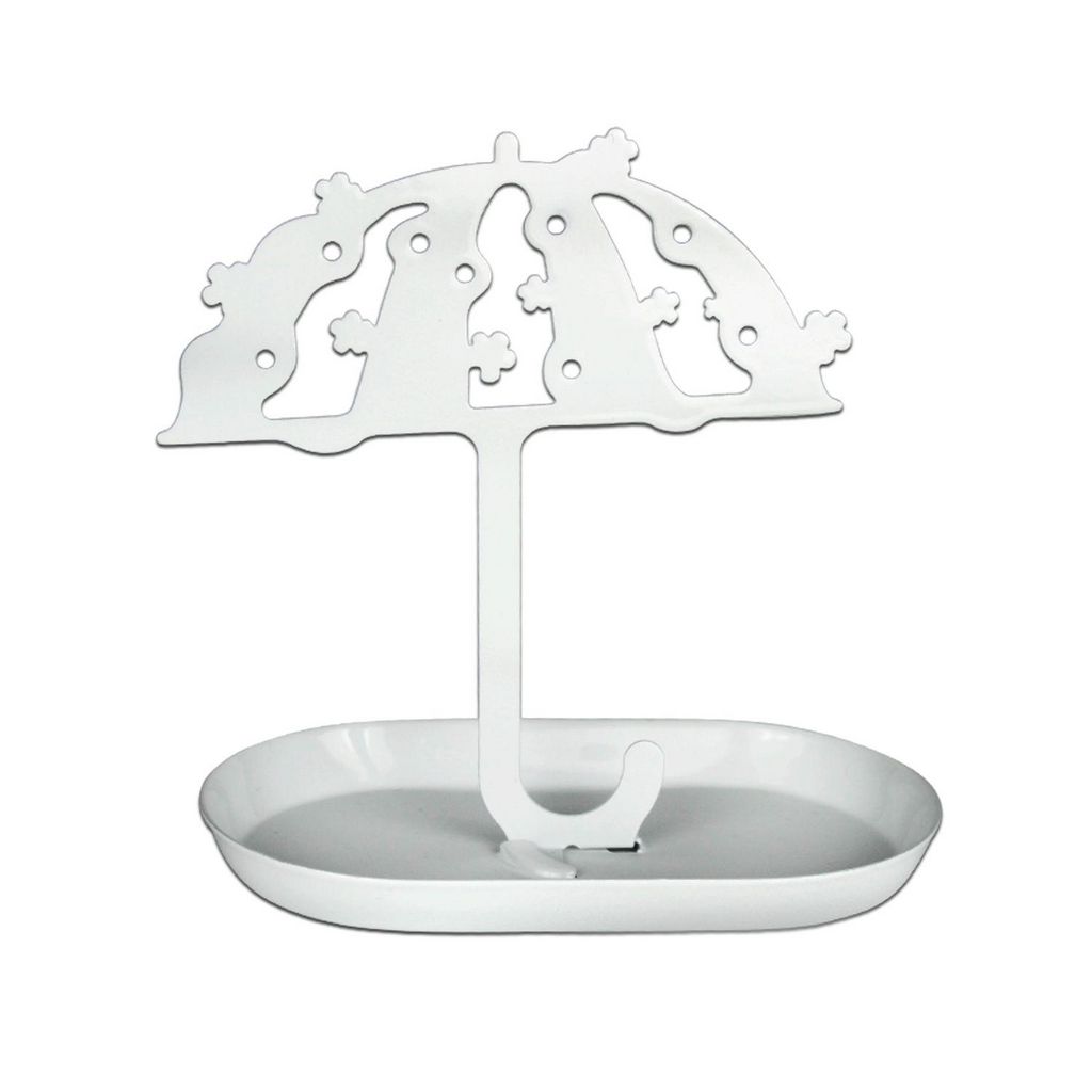 Accrochez avec fantaisie vos bijoux sur ce porte bijoux baroque et décoratif. Pratique et esthétique à la fois il vous permettra d'accrocher quatre paires de boucles d'oreilles, vos bracelets et colliers. Une coupelle a été ajoutée au pied du parapluie pour ranger vos bagues et objets précieux.