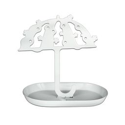 Accrochez avec fantaisie vos bijoux sur ce porte bijoux baroque et décoratif. Pratique et esthétique à la fois il vous permettra d'accrocher quatre paires de boucles d'oreilles, vos bracelets et colliers. Une coupelle a été ajoutée au pied du parapluie pour ranger vos bagues et objets précieux.FICHE