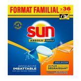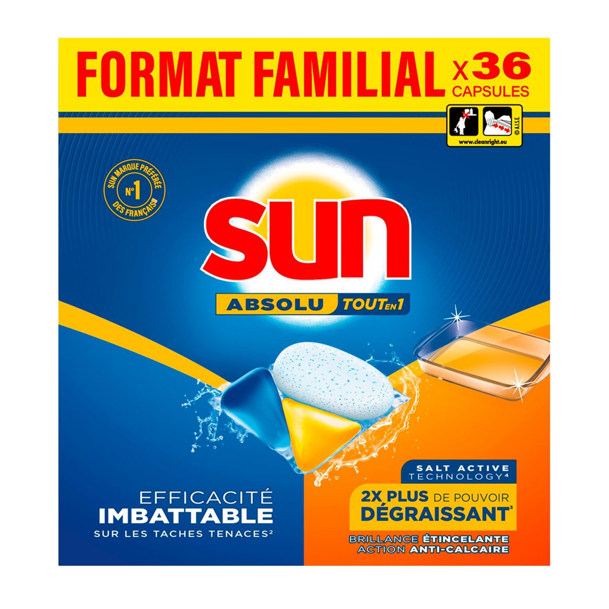 Les pastilles lave-vaisselle Sun Absolu Tout-en-1 Dégraissant 36 Lavages vous assurent une efficacité imbattable sur les taches tenaces* sur tous vos lavages.