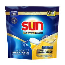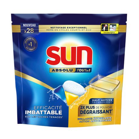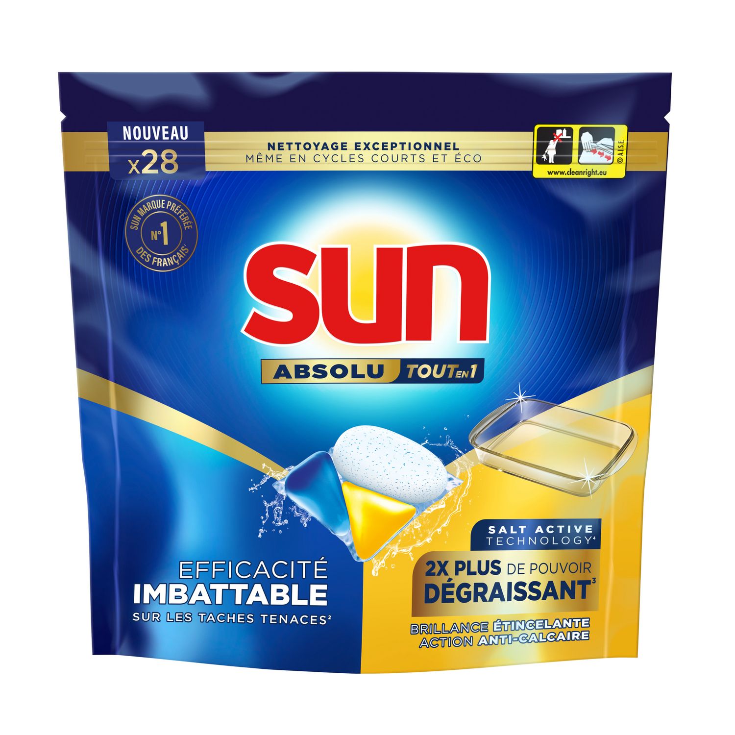 Les capsules lave-vaisselle Sun Absolu Tout-en-1 Dégraissant 28 Lavages vous assurent une efficacité imbattable sur les taches tenaces* pour tous vos lavages.