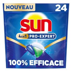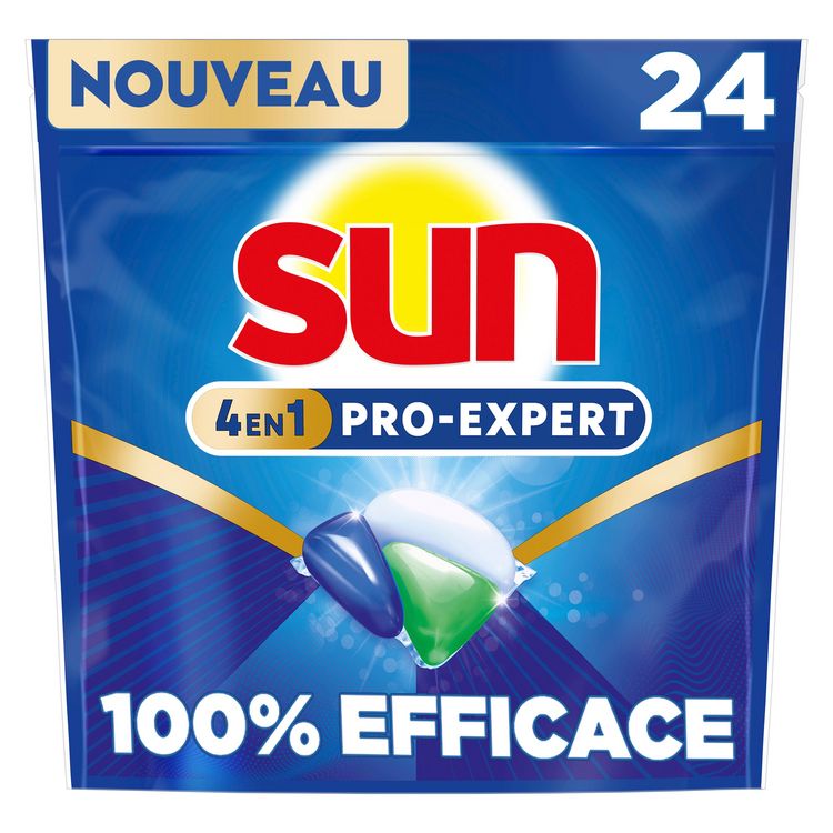 Découvrez l'efficacité du nouveau SUN PRO-EXPERT en format de 24 capsules. Idéal pour tester la puissance de sa formule sur les taches tenaces, avec un format vous offrant un excellent rapport qualité prix. Les nouvelles capsules lave-vaisselle SUN PRO-EXPERT 24 lavages combinent la puissance de la poudre et la brillance du gel pour vaisselle parfaitement sèche et brillante à chaque cycle. Grâce à la technologie CLEANBOOST™, combinaison d'enzymes qui découpent les résidus alimentaires avant de les dissoudre pendant le lavage, notre capsule lave-vaisselle PRO-EXPERT est conçue spécifiquement pour éliminer les taches de brûlé de + de 72 h¹. SUN PRO-EXPERT dégraisse en profondeur, protège², fait briller et sécher votre vaisselle ! Une solution complète en un seul produit lave-vaisselle qui répond aux besoins des consommateurs. Depuis 60 ans, Sun innove et améliore régulièrement la performance de ses produits, tout en contribuant à un mode de vie durable. Sun définit sa stratégie Clean Future qui vise à adopter et à transformer ses usines, ses processus de production et ses emballages pour être plus respectueux de l'environnement, sans faire de compromis sur la performance de ses produits, qui reste la priorité. Sun est aussi une marque intégrée à l'économie locale avec la production de ses tablettes Classic & Tout en 1, de son sel régénérant et de ses poudres en France, dans l'usine de Saint Vulbas. ¹Renforcée vs formule précédente. Test laboratoire – Avril 2024. ²Test laboratoire - Mai 2024, protection contre le calcaire.