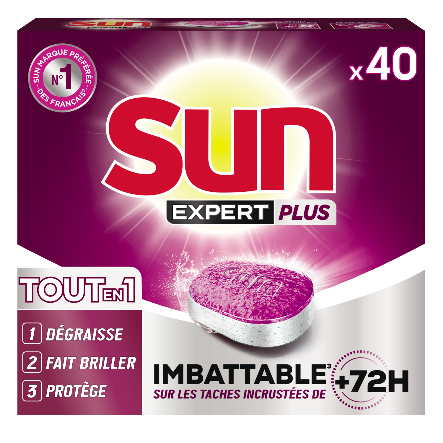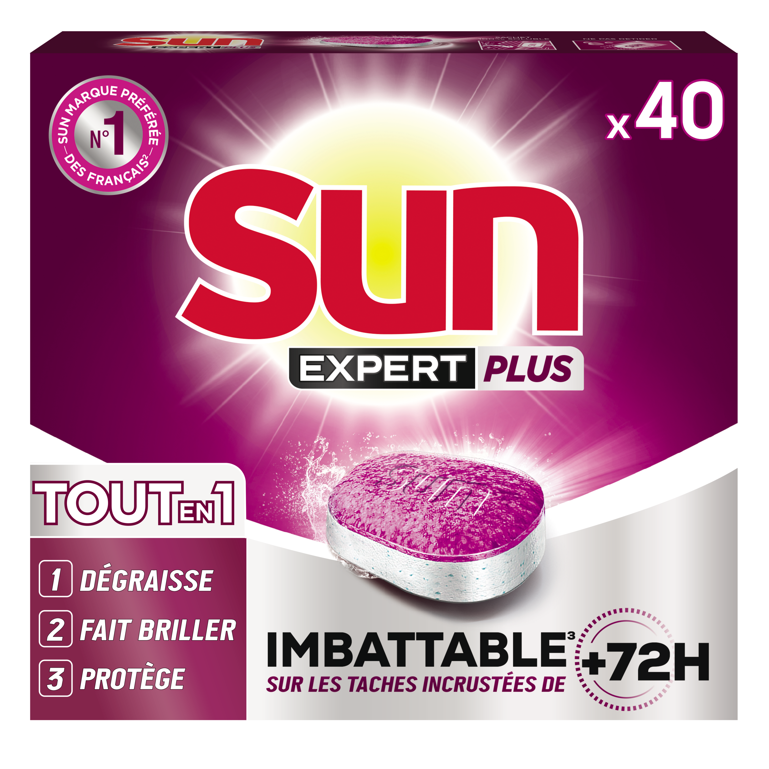 Sun n° 1 expert de l'efficacité ! Profitez de toute l'expertise Sun grâce aux tablettes lave-vaisselle Expert Plus dans son format de 40 lavages.