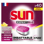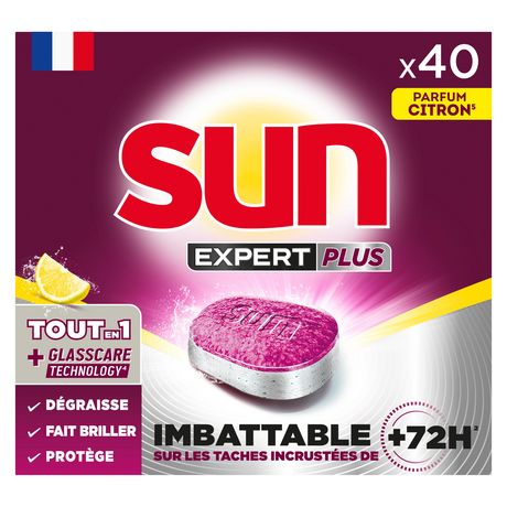 Sun n° 1 expert de l'efficacité ! Profitez de toute l'expertise Sun grâce aux pastilles lave-vaisselle Expert Plus Citron dans son format de 40 lavages.