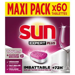 Sun n° 1 expert de l'efficacité ! Profitez de toute l'expertise Sun grâce aux tablettes lave-vaisselle Expert Plus Regular dans son format de 60 lavages.