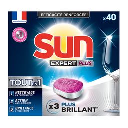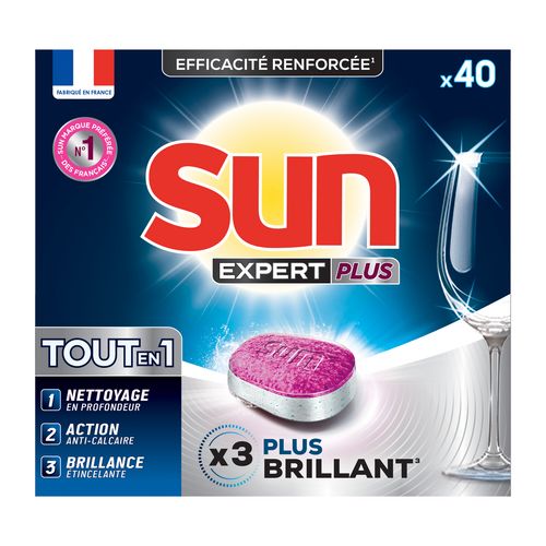 Sun n° 1 expert de l'efficacité ! Profitez de toute l'expertise Sun grâce aux tablettes lave-vaisselle Expert Plus Brillance dans son format de 40 lavages.