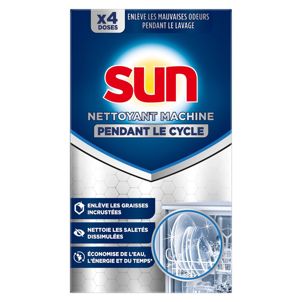 Sun répond à toutes vos attentes : avoir une vaisselle brillante, prête à l'emploi et une machine parfaitement propre ! Fini la corvée du nettoyage manuel de votre lave-vaisselle : Sun Nettoyant Machine Pendant le Cycle x4 doses enlève les mauvaises odeurs de votre machine durant le lavage de votre vaisselle. Profitez d'une machine parfaitement entretenue pour un minimum d'effort ! Ce complément de lavage élimine les dépôts de calcaire. Boostez les performances de votre lave-vaisselle avec le nettoyant Sun qui nettoie les saletés dissimulées. Ce nettoyant s'utilise durant le cycle de lavage et permet donc d'économiser de l'eau, de l'énergie et du temps*. Depuis ses débuts en 1965, Sun n'a cessé de se consacrer à l'innovation en créant des produits qui vous aident à prendre soin de votre vaisselle et de votre lave-vaisselle. Fort de plus de 60 ans d'expertise, Sun améliore constamment les formules de ses produits afin qu'elles fonctionnent à des températures plus basses, ou en cycle plus court, et vous permettent de faire des économies d'eau et d'énergie. Dans une démarche de développement durable, tous les emballages en carton Sun sont faits de 85 % de papier recyclé, et sont recyclables et biodégradables. Sun s'engage à offrir efficacité et propreté à votre vaisselle tout en respectant mieux l'environnement. *Économise de l'eau et de l'énergie grâce à l'usage du Nettoyant machine en profondeur lors d'un cycle éco vs un cycle normal ou intensif et économise du temps grâce à un cycle court vs un cycle normal ou intensif.