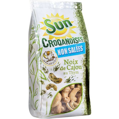 Noix de cajou grillées au thym 180g SUN Devenez la star de l’apéro en ramenant ces noix de cajou…au thym ! Leur saveur, leur douceur et leur originalité feront plaisir à tous les convives. En plus, vous pourrez dire que c’est une recette made in France car nous les grillons et enrobons de thym dans notre usine à Marseille.