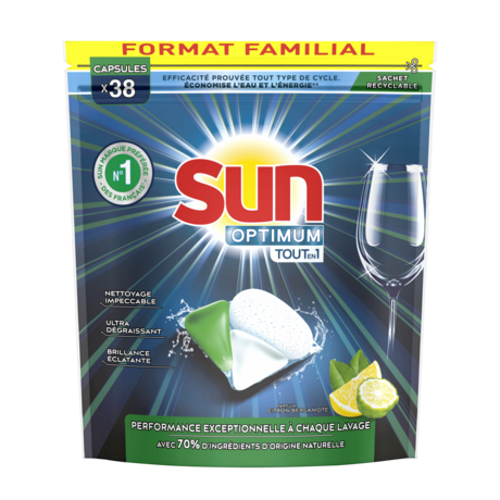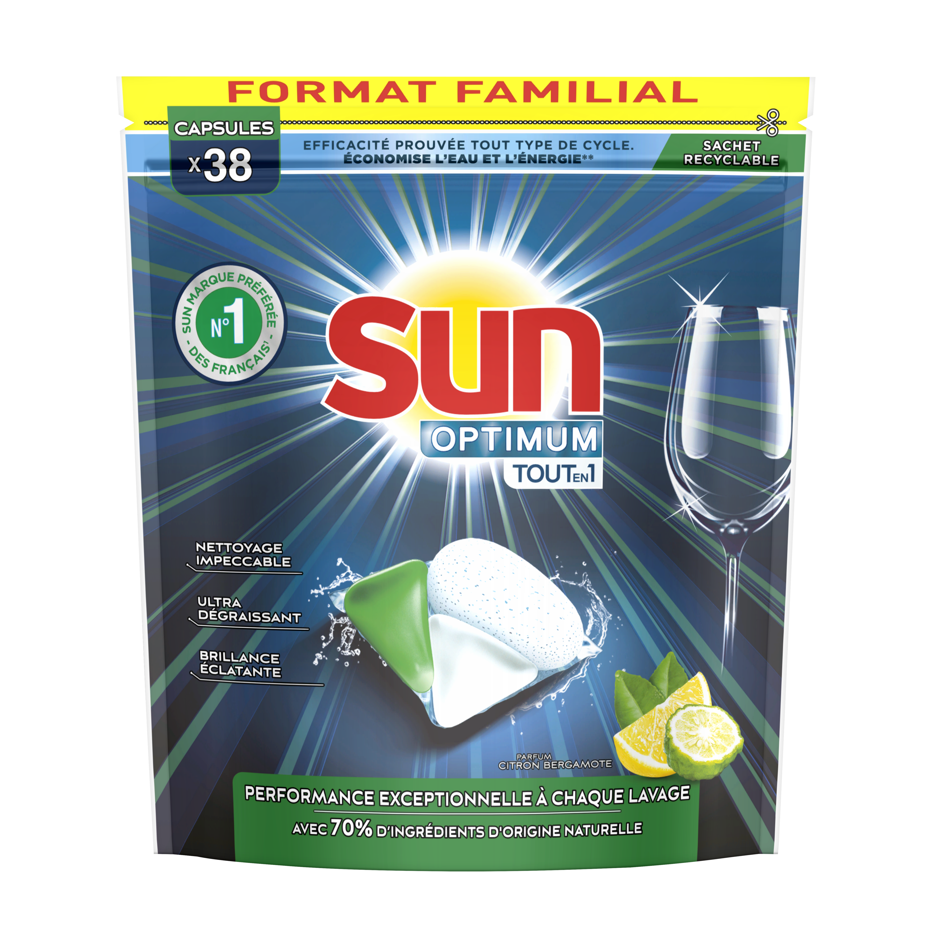 Les 38 capsules lave-vaisselle Sun Optimum Tout En 1 Citron Bergamote associent le meilleur du gel et de la poudre dans une capsule triple action.