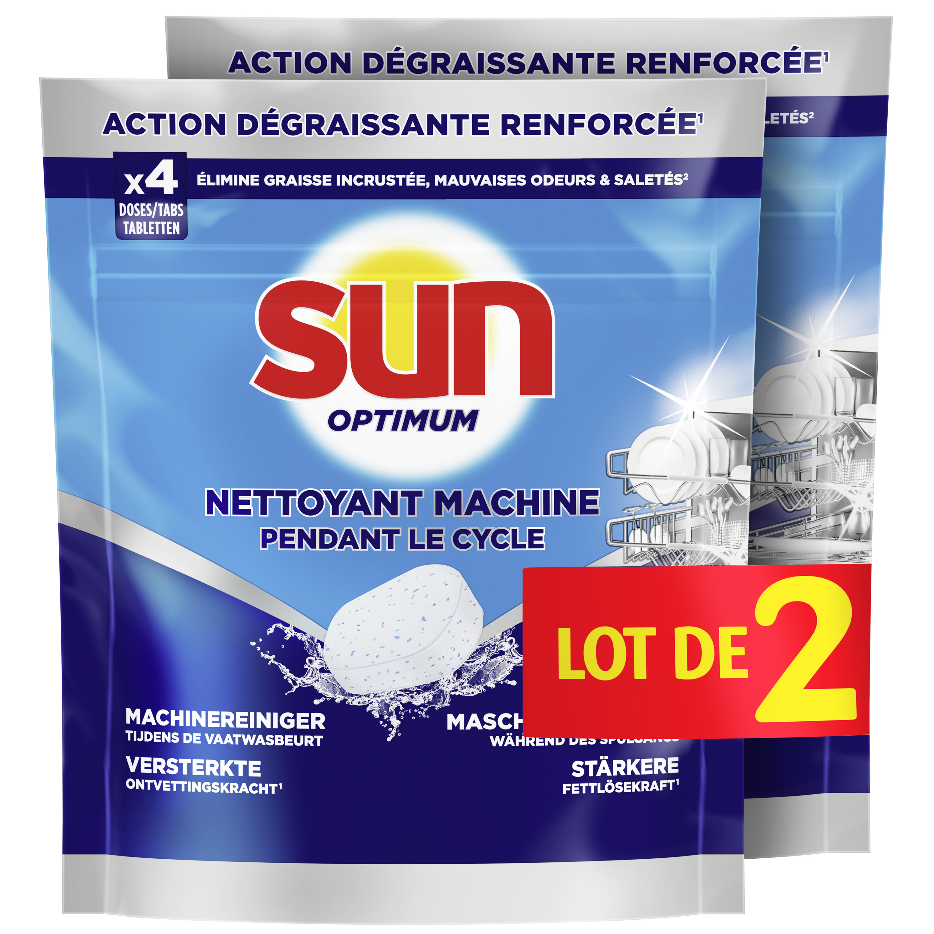 Pour un résultat optimal et un entretien parfait, nous vous recommandons d'utiliser Sun Optimum Nettoyant Machine pendant le cycle une fois par mois. En achetant ce produit lave-vaisselle, profitez de 4 mois d'entretien maximisé pour votre machine lave-vaisselle. Remplissez votre lave-vaisselle. Mettez le nettoyant machine Sun à n'importe quel endroit de votre lave-vaisselle. Utilisez votre détergent habituel puis lancez un cycle de lavage ordinaire.