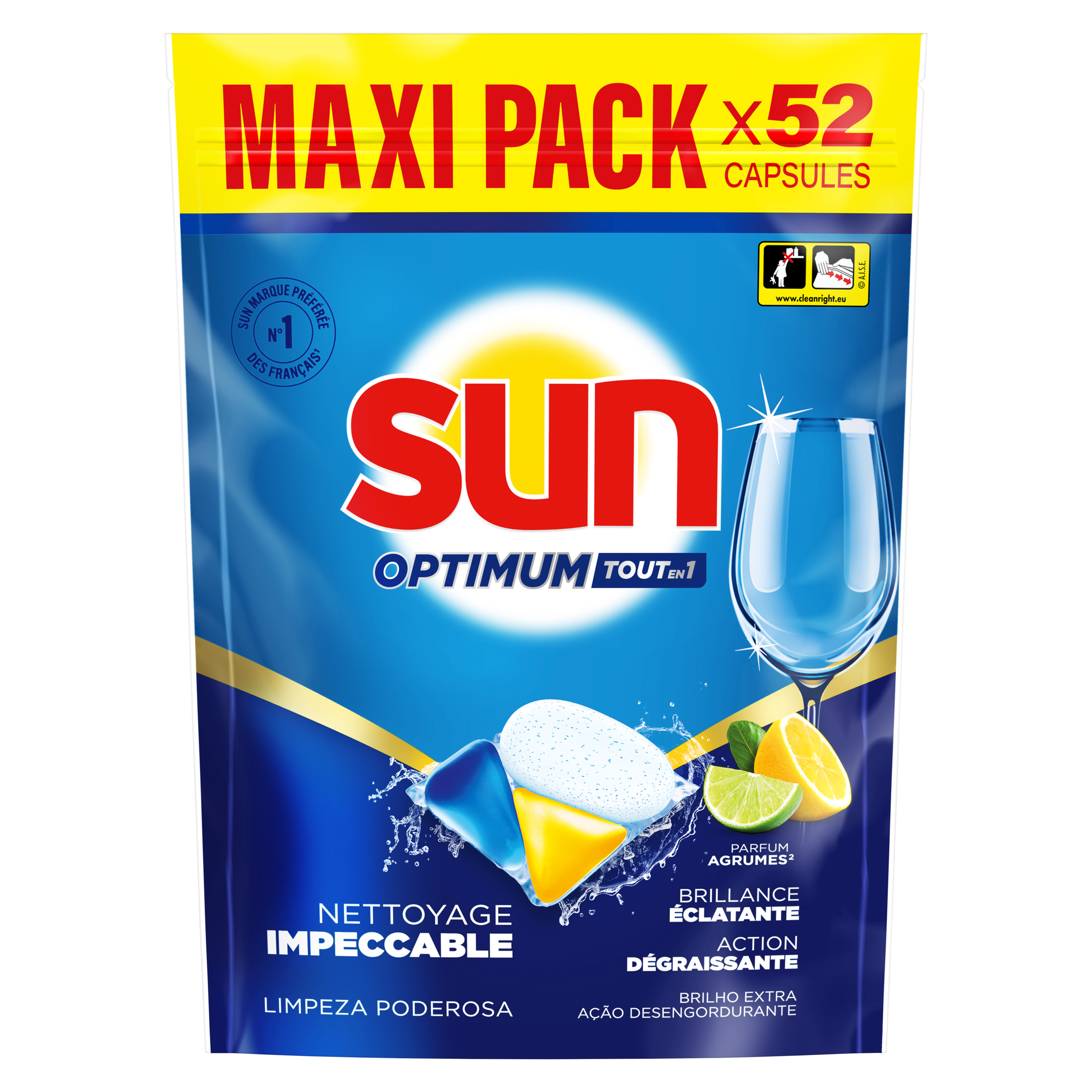 Les produits lave-vaisselle Sun Optimum Tout-en-1 52 Lavages vous garantissent un nettoyage impeccable, une brillance éclatante et une action anti-graisse pour tous vos lavages. Avec notre variante agrume, profitez d'un parfum rafraîchissant. Les nouvelles pastilles pour lave-vaisselle Sun Optimum Tout-en-1 associent le meilleur de la poudre pour un nettoyage en profondeur et une action ultra dégraissante, avec le meilleur du gel pour une vaisselle sèche et brillante ! Une solution complète en un seul produit lave-vaisselle qui assure les fonctions de détergent, liquide de rinçage et sel régénérant. Cette capsule offre à la fois une performance exceptionnelle et une formule sans phosphates avec 70 % d'ingrédients d'origine naturelle. Nos pastilles lave-vaisselle sont efficaces en cycle « éco » et en cycle court grâce à une dissolution rapide. Elles permettent donc une consommation réduite en énergie et en eau. Pas besoin de pré-rincer : notre capsule lave-vaisselle assure cette fonction et garantit également une vraie protection de votre vaisselle et lave-vaisselle lavage après lavage. Conseil d'utilisation : placez simplement la pastille dans le bac détergent sans ajouter ni sel, ni liquide de rinçage en évitant de la manipuler avec les mains humides. Avec une eau très calcaire (>35°fH), il est toutefois recommandé d'ajouter Sun Sel Régénérant. Vous n'avez plus qu'à retourner profiter du reste de votre journée, notre capsule Sun Optimum Tout-en-1 se charge du reste !