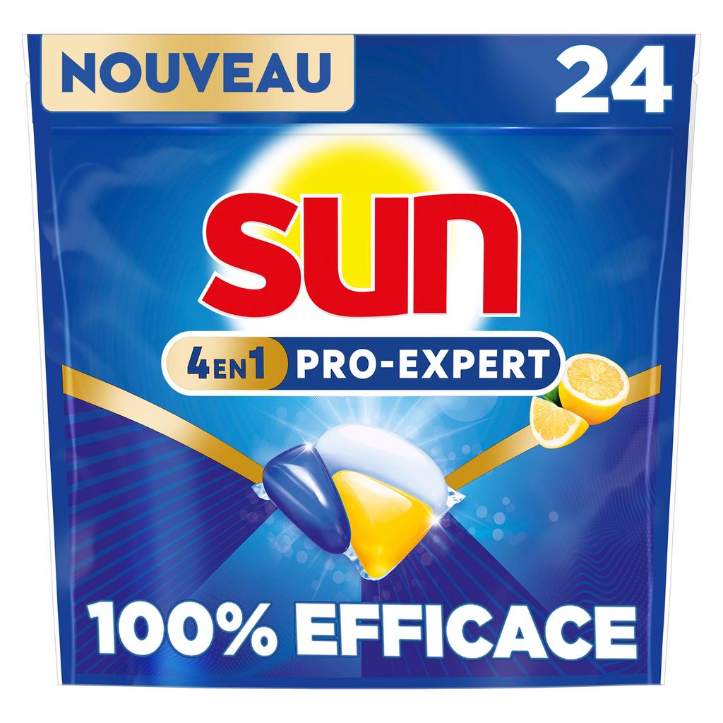 Découvrez la fraîcheur² intense du citron et l'efficacité du nouveau SUN PRO-EXPERT CITRON en format de 24 capsules. Idéal pour tester la puissance de sa formule sur les taches tenaces, avec un format vous offrant un excellent rapport qualité prix. Les nouvelles capsules lave-vaisselle SUN PRO-EXPERT CITRON 24 lavages combinent la puissance de la poudre et la brillance du gel pour une vaisselle parfaitement sèche et brillante à chaque cycle. Grâce à la technologie CLEANBOOST™, combinaison d'enzymes qui découpent les résidus alimentaires avant de les dissoudre pendant le lavage, nos capsules lave-vaisselle PRO-EXPERT sont conçues spécifiquement pour éliminer les taches de brûlé de + de 72 h¹, tout en laissant un parfum² de citron frais. SUN PRO-EXPERT CITRON dégraisse en profondeur, protège³, fait briller et sécher votre vaisselle ! Une solution complète en un seul produit lave-vaisselle qui répond aux besoins des consommateurs. Depuis 60 ans, Sun innove et améliore régulièrement la performance de ses produits, tout en contribuant à un mode de vie durable. Sun définit sa stratégie Clean Future qui vise à adopter et à transformer ses usines, ses processus de production et ses emballages pour être plus respectueux de l'environnement, sans faire de compromis sur la performance de ses produits, qui reste la priorité. Sun est aussi une marque intégrée à l'économie locale avec la production de ses tablettes Classic & Tout en 1, de son sel régénérant et de ses poudres en France, dans l'usine de Saint Vulbas. ¹Renforcée vs formule précédente. Test laboratoire – Avril 2024. ²Parfum de synthèse. ³Test laboratoire - Mai 2024, protection contre le calcaire.
