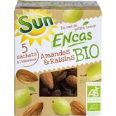 Emportez partout avec vous un sachet SUN ENCAS BIO. Vous êtes pressé, vous avez faim, vous cherchez désespérément un goût bon et sain pour vous et vos enfants, vous avez besoin d'un petit coup de boost ?? Alors le mélange amandes et raisins Bio est fait pour vous. Mélange d'amandes décortiquées et raisins secs issus de l'agriculture biologique.