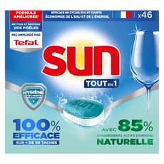 Pas toujours facile de choisir entre efficacité et meilleur respect de l'environnement. Avec les pastilles lave-vaisselle Sun 46 Lavages, optez pour des produits maintenant 100 % efficaces sur + de 99 taches du quotidien, notamment les taches d'amidon présents dans les 10 plats les plus cuisinés des Français. Toujours avec 85 % d'ingrédients actifs d'origine naturelle, on vous propose une solution complète en une seule tablette : la formule Sun Tout En 1 Hygiène Ecolabel enlève les taches difficiles et garantit une vaisselle étincelante à chaque lavage, tout en respectant le cahier des charges Ecolabel. TEFAL a réalisé des tests en laboratoire pour comprendre quels détergents lave-vaisselle étaient les plus respectueux de leurs produits, particulièrement de leurs poêles à induction. Nos pastilles ressortent comme les moins agressives pour les ustensiles de cuisine, particulièrement les poêles et casseroles compatibles induction, avec un effet notable : des ustensiles qui durent vraiment plus longtemps ! Notre nouvelle formule agit comme une couche protectrice sur vos poêles afin de prévenir leur détérioration. Profitez-en, et gagnez du temps en mettant vos poêles (y compris à induction) au lave vaisselle sans mauvaise conscience ! Terminé le lavage à la main, Sun s'occupe de tout ! Les tablettes lave-vaisselle Sun vous garantissent un confort d'utilisation spécialement conçu pour faciliter votre quotidien et assurent un résultat impeccable lavage après lavage, même sans pré-rinçage. Ces pastilles lave-vaisselle sont efficaces à basse température, ainsi qu'en cycles éco et court, afin d'économiser de l'eau, du temps et de l'énergie. Grâce à leur formule intégrale, les tablettes lave-vaisselle Sun Tout en 1 permettent une action complète : inutile d'ajouter du sel régénérant pour protéger contre le calcaire ou du liquide de rinçage pour faire briller ! Nos dosettes lave-vaisselle sont fabriquées en France et sont contenues dans un sachet hydrosoluble que vous n'avez pas à retirer, pour une utilisation plus pratique. Elles contiennent zéro phosphate, et sont vendues dans un emballage en carton entièrement recyclable et fabriqué à partir de carton à 90 % recyclé, à refermer après chaque utilisation pour protéger son contenu de l'humidité ! *Versus formule précédente.