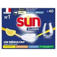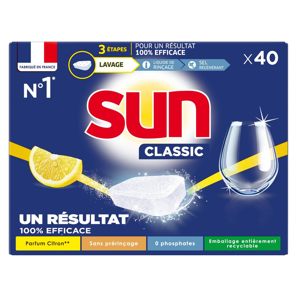 Les tablettes lave-vaisselle Sun Classic Citron nettoient parfaitement votre vaisselle, même en cycle court ! Profitez d'une agréable odeur de citron* à l'ouverture de votre lave-vaisselle. Grâce à ses agents Cleanboost, la tablette Sun Classic Citron permet d'économiser de l'eau et de l'électricité : efficace en cycle court et à basse température. Les pastilles Sun vous garantissent un résultat impeccable, une vaisselle étincelante et parfaitement protégée, même sans prérinçage. Les pastilles Sun Classic Citron sont fabriquées en France dans une usine engagée pour une planète plus verte. Pour un résultat impeccable sur votre vaisselle, utilisez la combinaison des trois produits : la tablette Sun Classic Citron nettoie en profondeur, Sun Liquide de Rinçage garantit une brillance exceptionnelle et Sun Sel Régénérant prévient les dépôts de calcaire. L'expertise Sun au service du lavage de votre vaisselle, dans un emballage recyclé et recyclable. Fort de plus de 50 ans d'expertise, Sun améliore constamment les formules de ses produits lave-vaisselle afin qu'elles fonctionnent à des températures plus basses ou en cycle plus court, et vous permettent de faire des économies d'eau et d'énergie. Dans une démarche de développement durable, tous les emballages en carton Sun sont recyclables et biodégradables. Sun s'engage à offrir efficacité et propreté à votre vaisselle tout en respectant mieux l'environnement. *Parfum de synthèse.
