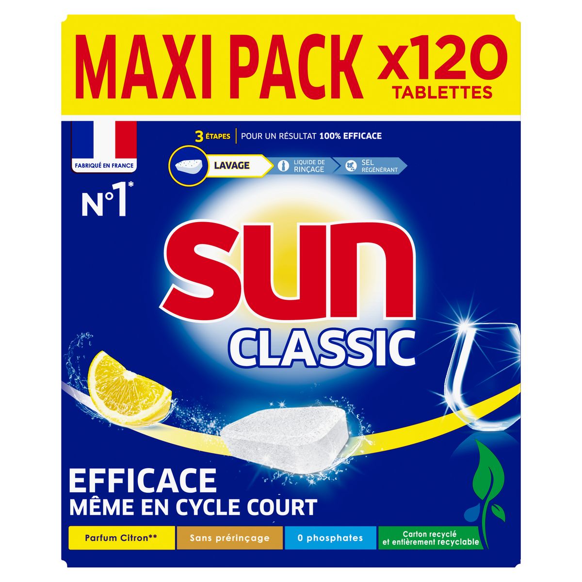 Les tablettes lave-vaisselle Sun Classic Citron 120 Lavages nettoient parfaitement votre vaisselle, même en cycle court ! Profitez d'une agréable odeur de citron* à l'ouverture de votre lave-vaisselle. Grâce à ses agents Cleanboost, la tablette Sun Classic Citron permet d'économiser de l'eau et de l'électricité : efficace en cycle court et à basse température. Les pastilles Sun vous garantissent un résultat impeccable, une vaisselle étincelante et parfaitement protégée, même sans prérinçage. Les pastilles Sun Classic Citron sont fabriquées en France dans une usine engagée pour une planète plus verte. Pour un résultat impeccable sur votre vaisselle, utilisez la combinaison des trois produits : la tablette Sun Classic Citron nettoie en profondeur, Sun Liquide de Rinçage garantit une brillance exceptionnelle et Sun Sel Régénérant prévient les dépôts de calcaire. L'expertise Sun au service du lavage de votre vaisselle, dans un emballage recyclé et recyclable. Fort de plus de 50 ans d'expertise, Sun améliore constamment les formules de ses produits lave-vaisselle afin qu'elles fonctionnent à des températures plus basses ou en cycle plus court, et vous permettent de faire des économies d'eau et d'énergie. Dans une démarche de développement durable, tous les emballages en carton Sun sont recyclables et biodégradables. Sun s'engage à offrir efficacité et propreté à votre vaisselle tout en respectant mieux l'environnement. *Parfum de synthèse.
