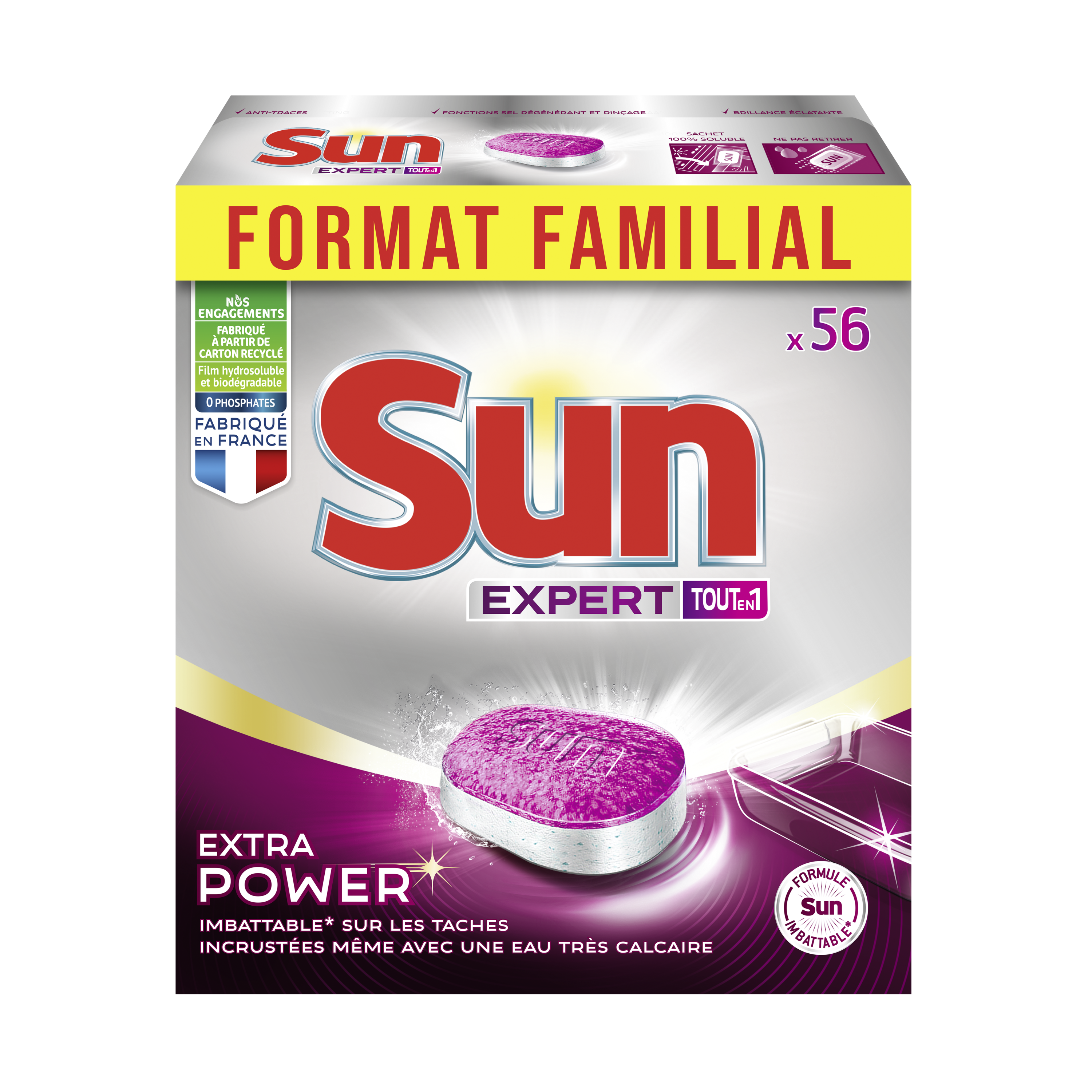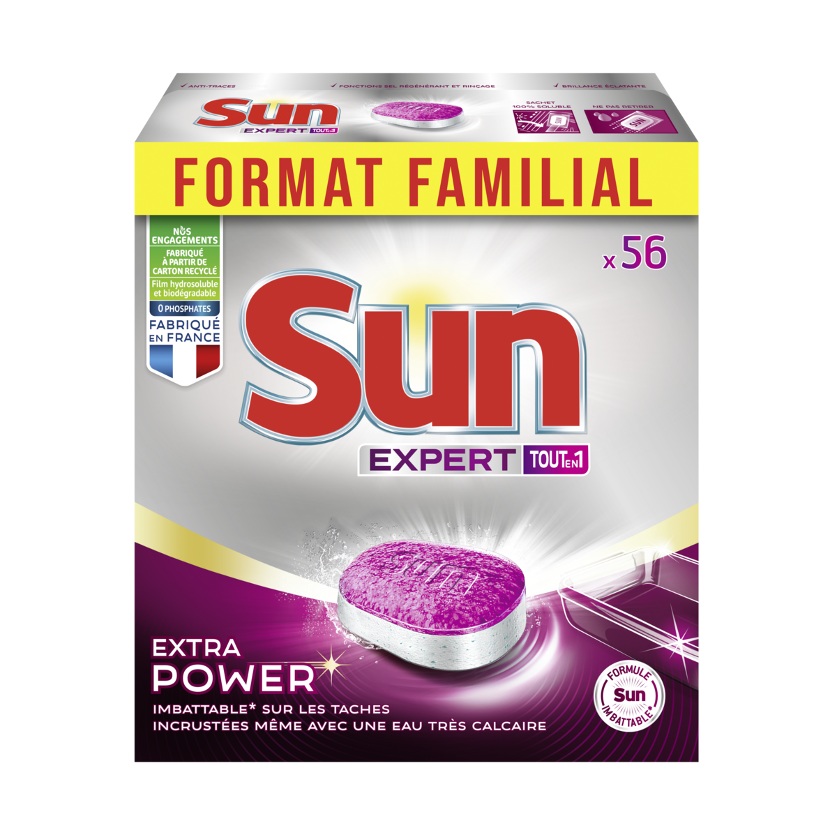 Sun n°1 pour l'efficacité ! Profitez de toute l'expertise Sun grâce aux tablettes Lave-Vaisselle Extra Power au format familial 56 Lavages.