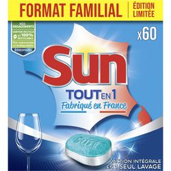 Depuis ses débuts en 1965, Sun n’a cessé de se consacrer à l’innovation en créant des produits qui vous aident à prendre soin de votre vaisselle et de votre lave vaisselle. Fort de plus de 50 ans d’expertise et marque N°1* en France, Sun améliore constamment les formules de ses produits afin qu’elles fonctionnent à basses températures, en cycle court et vous permettent de faire des économies d’eau et d’énergie. Sun s’implique dans une démarche de développement durable, tous ses emballages en cartons sont composés de 85% de papier recyclé et sont également recyclables et biodégradables**. Les tablettes pour lave vaisselle Sun Tout-en-1 sont fabriquées en France**, dans notre usine à St Vulbas, prêt de Lyon. Sun lance ses nouvelles tablettes lave vaisselle Tout-en-1, avec la technologie Sun Pure Clean™. Grâce à leur formule intégrale, pas besoin d’ajouter de sel régénérant ni de liquide de rinçage. ! Les tablettes Sun Tout-en-1 sont contenues dans un sachet hydrosoluble que vous n’avez pas à retirer, afin de vous assurer une meilleure praticité d’utilisation. Les tablettes lave vaisselle Sun Tout-en-1 vous offrent une solution complète de lavage en 1 seule pastille. En plus de prendre soin de votre vaisselle, les tablettes Sun Tout-en-1 protègent également votre lave vaisselle. Cette double-action vous garantit un confort d’utilisation spécialement pensé pour faciliter votre quotidien et assure un résultat impeccable lavage après lavage, même sans pré-rinçage. Pour vous permettre de mieux prévoir votre consommation de tablettes lave vaisselle et vous aider à choisir le produit qui vous convient, Sun vous indique désormais le nombre de mois de lavages*** correspondant à chaque format. *Sun, marque N°1 des produits lave vaisselle en France, volume HMSM CAM P9 2018 **Hors Tablettes Sun Pouvoir de la Nature ***sur base observée d’une moyenne de 13 machines/mois/acheteurs (données panels distributeurs & consommateurs 2016). Tablettes Lave-Vaisselle