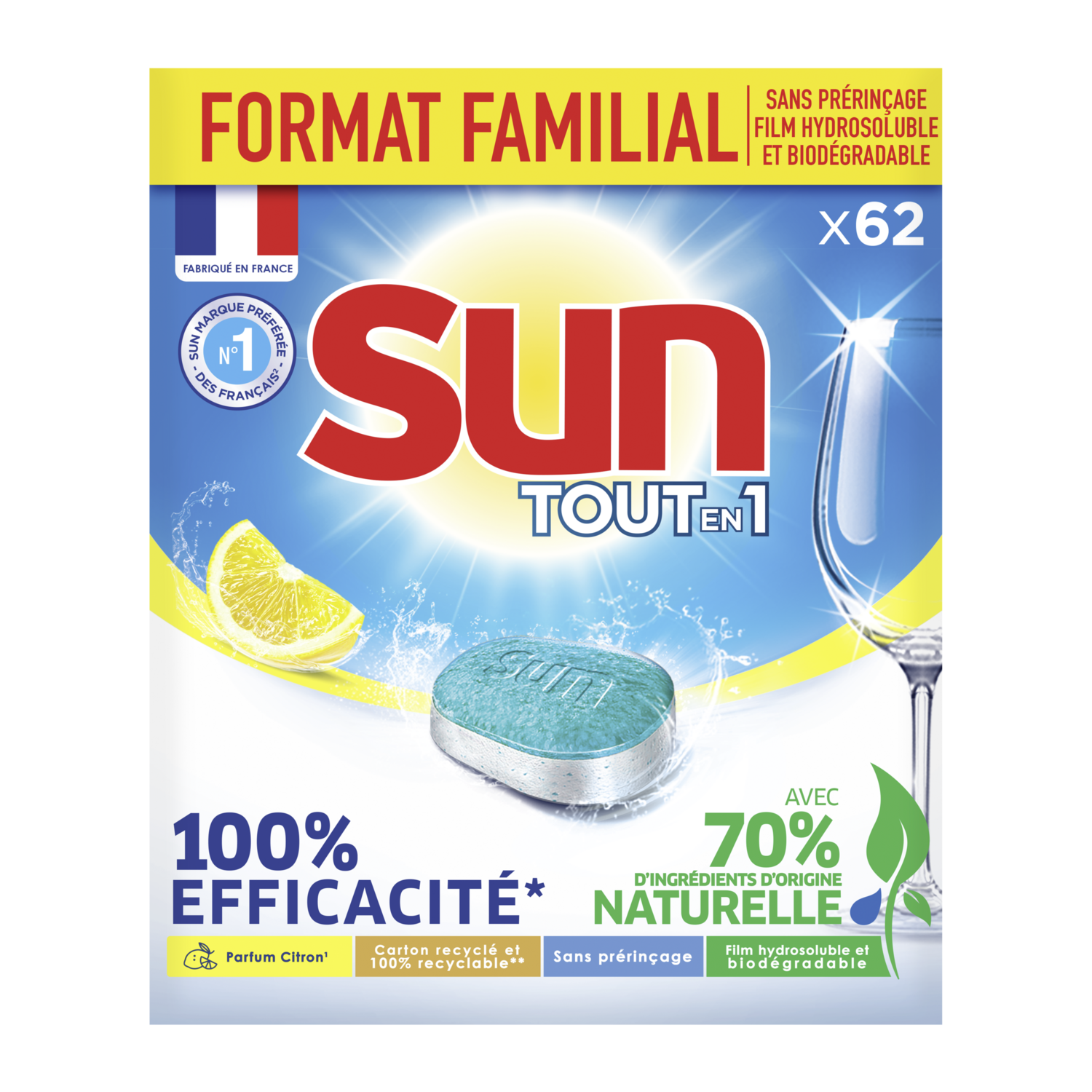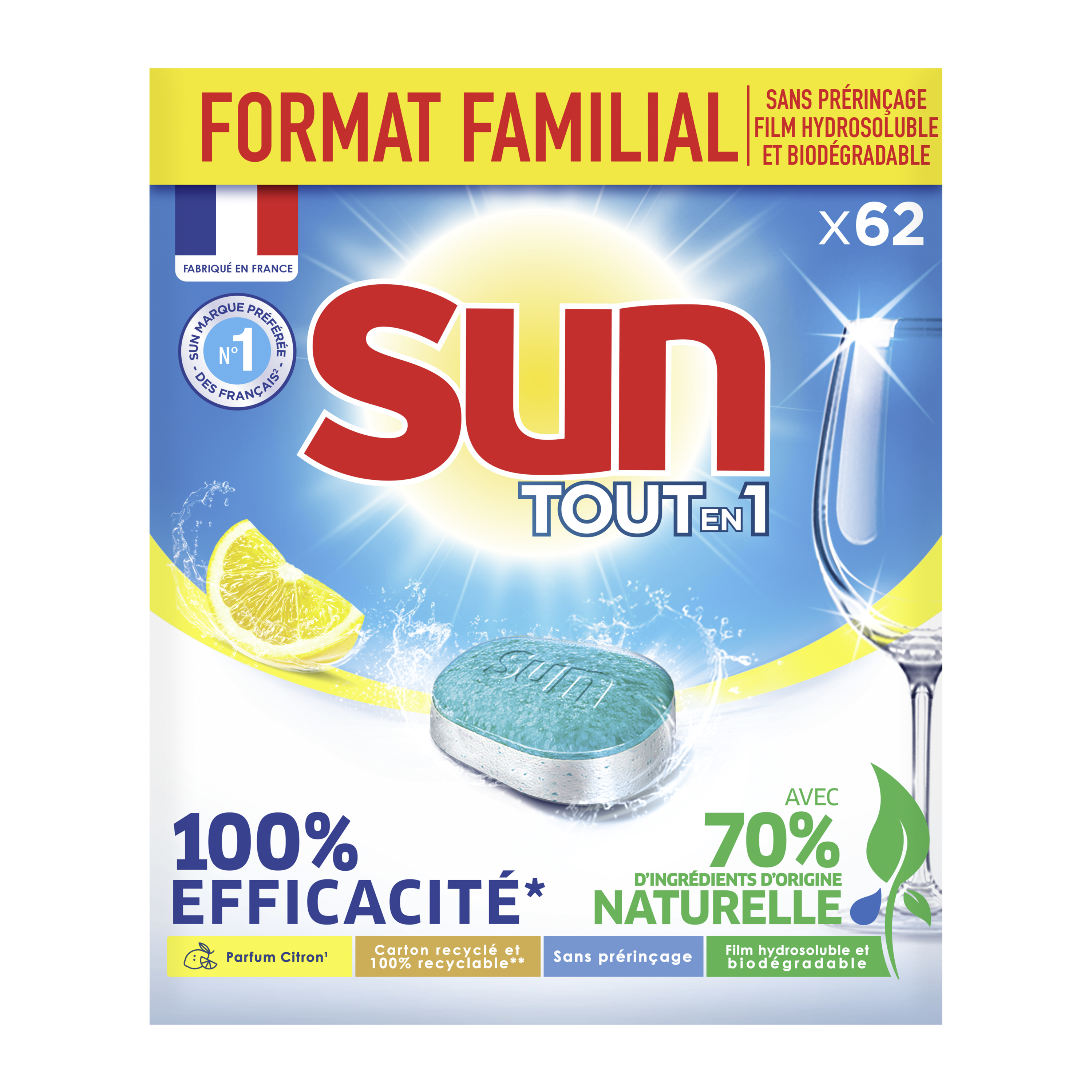 Ne changez rien, Sun change pour vous ! Pas facile de faire les bons gestes pour l’environnement tout en maintenant la même efficacité. Les nouvelles tablettes lave-vaisselle Sun Tout en 1 Parfum* Citron Ecolabel garantissent la même performance au lavage, mais avec 70 % d’ingrédients d’origine naturelle. Une solution complète en une seule tablette : la nouvelle formule Sun enlève les taches difficiles et garantit une vaisselle étincelante à chaque lavage, tout en respectant le cahier des charges Ecolabel. Nos tablettes pour lave-vaisselle sont fabriquées en France, dans une usine engagée pour une planète plus verte, notamment à travers le recyclage de tous ses déchets. Elles ne contiennent pas de phosphates, et sont vendues dans un emballage en carton 100?% recyclable, et fabriqué à partir de carton 90?% recyclé. Pas besoin de pré-rincer : leur action garantit une vraie protection de votre vaisselle, lavage après lavage. Placez la tablette dans le bac dédié ou directement dans votre machine, en évitant de la manipuler avec les mains humides. Inutile d'ajouter du sel et du liquide de rinçage : leurs fonctions sont remplies par la formule Tout En 1. Pour une eau très calcaire (>35°fH), il est toutefois recommandé d'ajouter Sun Sel Régénérant. Pour un résultat parfait, nous vous conseillons d'utiliser Sun Nettoyant Machine une fois par mois. Essayez les nouvelles tablettes Sun Tout en 1, 100 % efficaces en un seul lavage, maintenant avec 70 % d’ingrédients d’origine naturelle. *Parfum de synthèse Pastilles Lave-Vaisselle