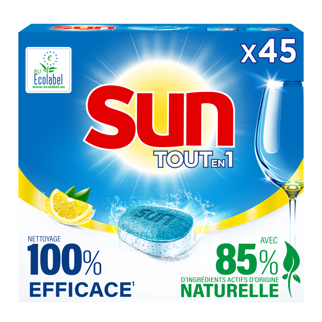 Pas toujours facile de choisir entre efficacité et meilleur respect de l'environnement. Avec Sun, optez pour des produits 100 % efficaces¹ avec 85 % d'ingrédients actifs d'origine naturelle. Une solution complète en une seule tablette : la formule Sun Tout En 1 Citron Ecolabel enlève les taches difficiles et garantit une vaisselle étincelante à chaque lavage, tout en respectant le cahier des charges Ecolabel. TEFAL a réalisé des tests en laboratoire pour comprendre quels détergents lave-vaisselle étaient les plus respectueux de leurs produits, notamment de leurs poêles à induction. Après seulement 50 lavages, avec la plupart des tablettes du marché, on observe une dégradation du fond des poêles. Sauf avec les tablettes Sun Tout en 1 ! Nos pastilles ressortent comme les moins agressives pour les ustensiles de cuisine, notamment les poêles et casseroles compatibles induction, avec un effet notable : des ustensiles qui durent vraiment plus longtemps ! Profitez-en, et gagnez du temps en mettant vos poêles (y compris à induction) au lave-vaisselle sans mauvaise conscience ! Terminé le lavage à la main, Sun s'occupe de tout ! Sun tablette Tout en 1 vous garantit un confort d'utilisation spécialement conçu pour faciliter votre quotidien et assure un résultat impeccable lavage après lavage, même sans pré-rinçage. Ces pastilles lave-vaisselle sont efficaces à basse température, ainsi qu'en cycles éco et court, afin d'économiser de l'eau, du temps et de l'énergie. Grâce à leur formule intégrale, les tablettes lave-vaisselle Sun Tout en 1 permettent une action complète : inutile d'ajouter du sel régénérant ou du liquide de rinçage ! Elles sont contenues dans un sachet hydrosoluble que vous n'avez pas à retirer, pour une utilisation plus pratique. Nos dosettes lave-vaisselle sont fabriquées en France, dans une usine engagée pour une planète plus verte, notamment à travers le recyclage de tous ses déchets. Elles contiennent zéro phosphate, et sont vendues dans un emballage en carton 100 % recyclable et fabriqué à partir de carton à 90 % recyclé. ¹ 100 % de l'efficacité Sun Tout en 1 avec 85% d'ingrédients actifs nettoyants d'origine naturelle. ² Versus formule précédente.