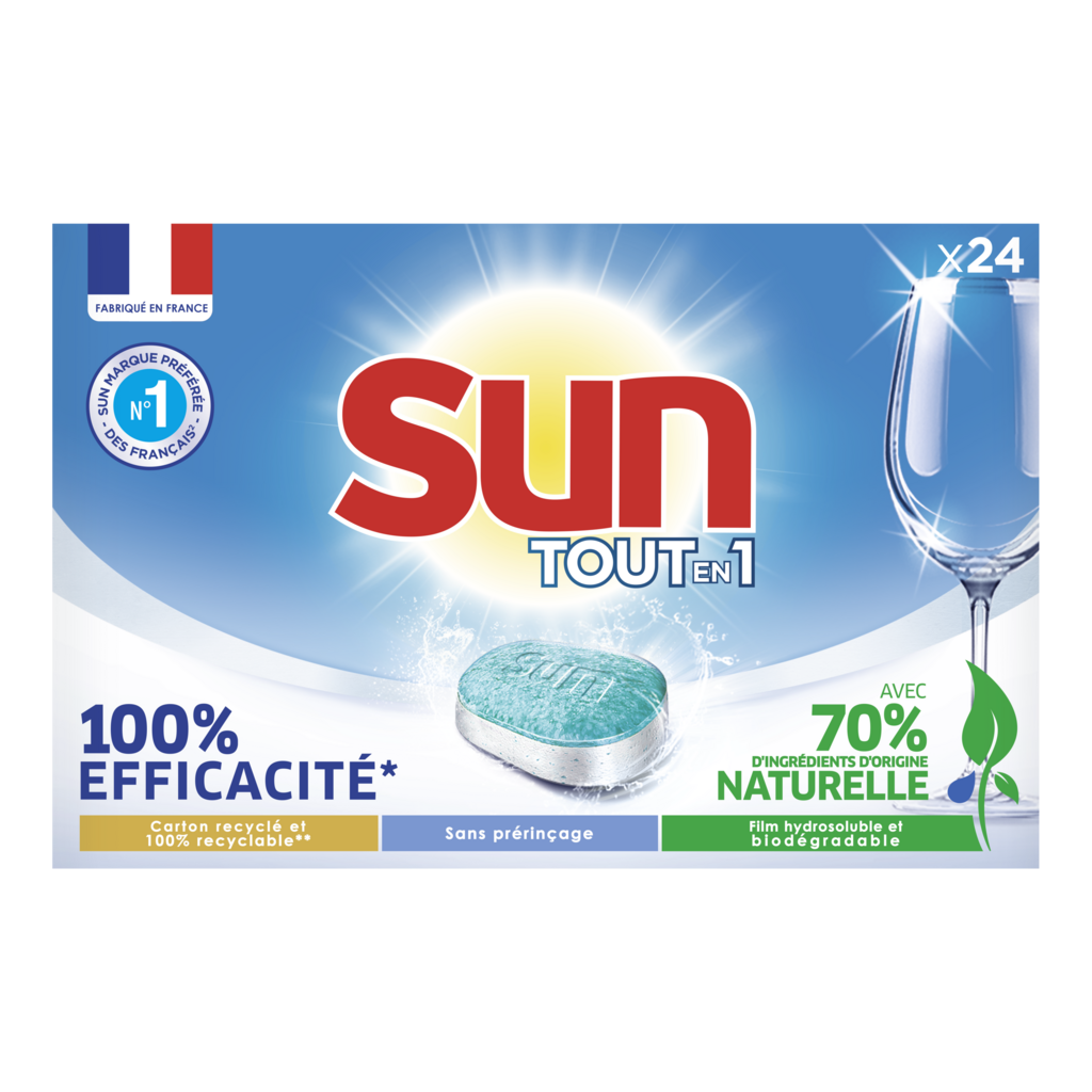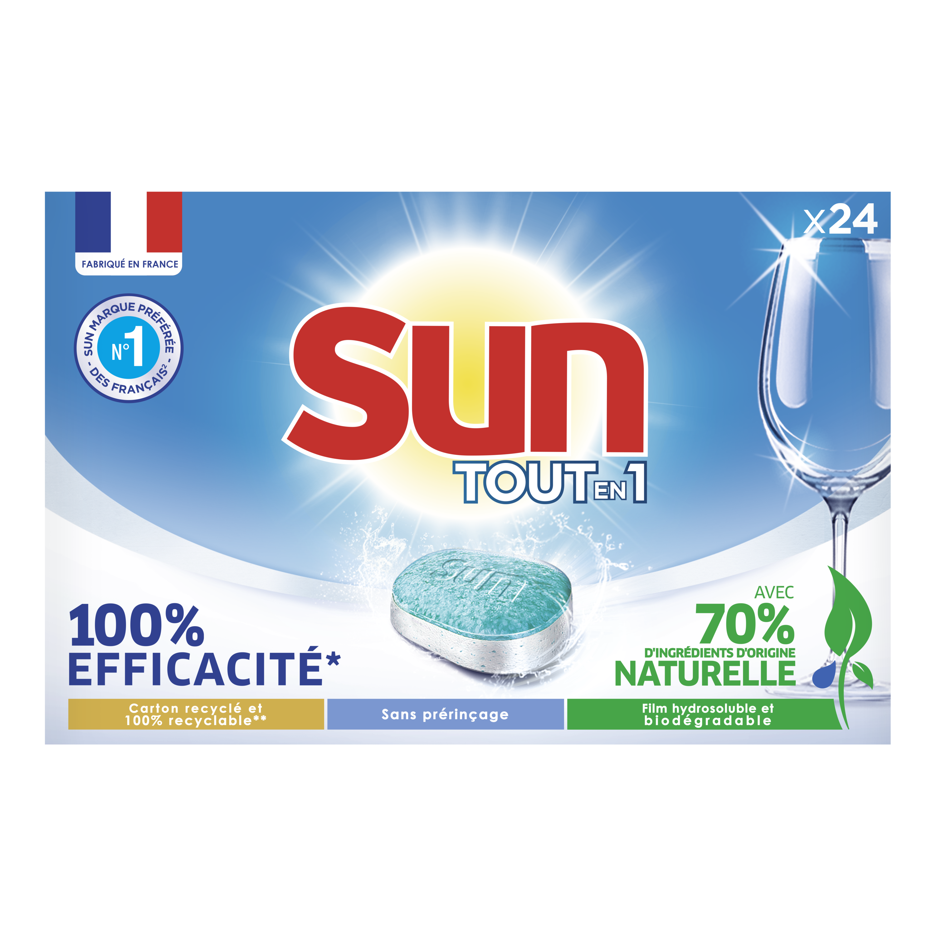 Essayez les tablettes Sun Tout en 1, 100 % efficaces en 1 seul lavage, maintenant avec 70 % d’ingrédients d’origine naturelle.