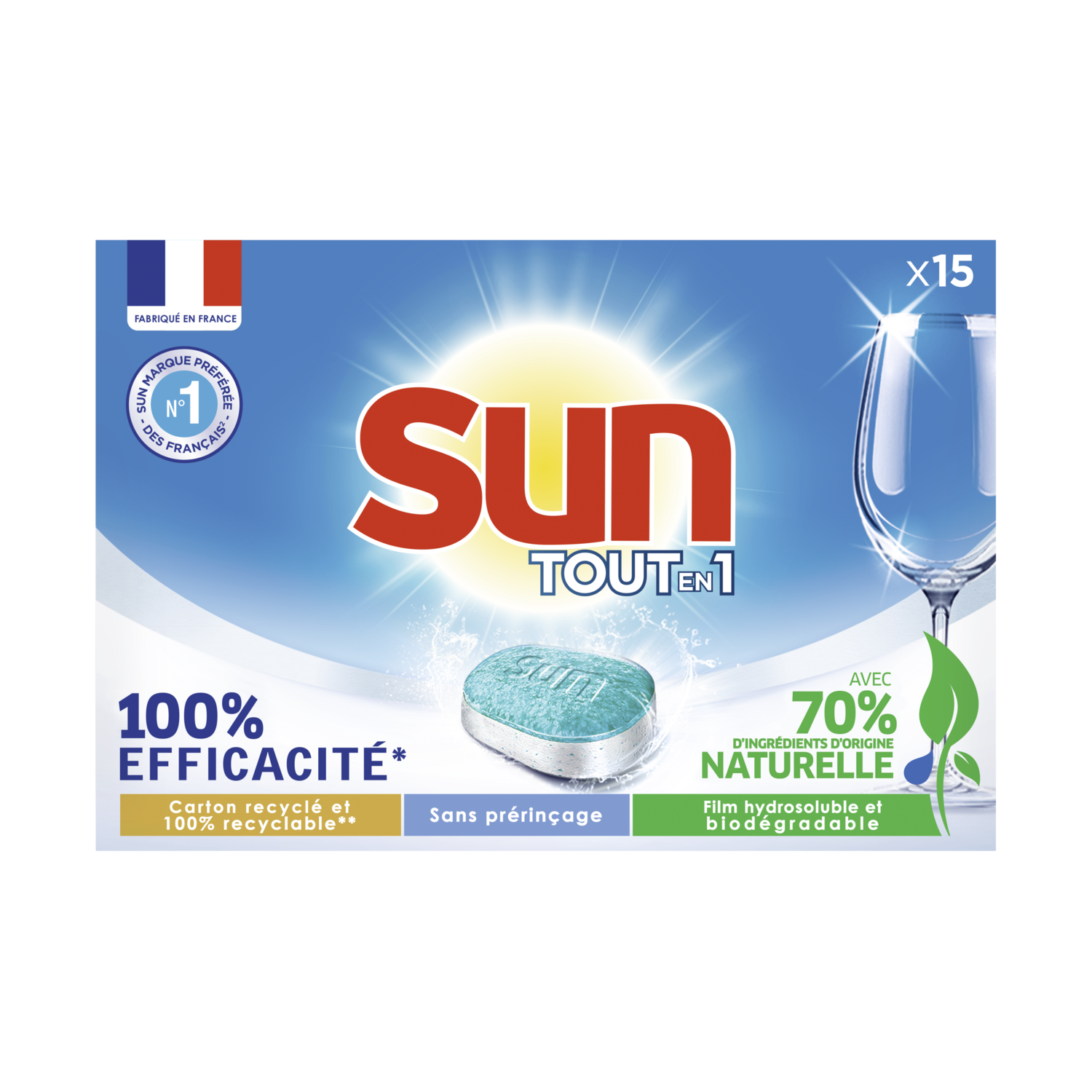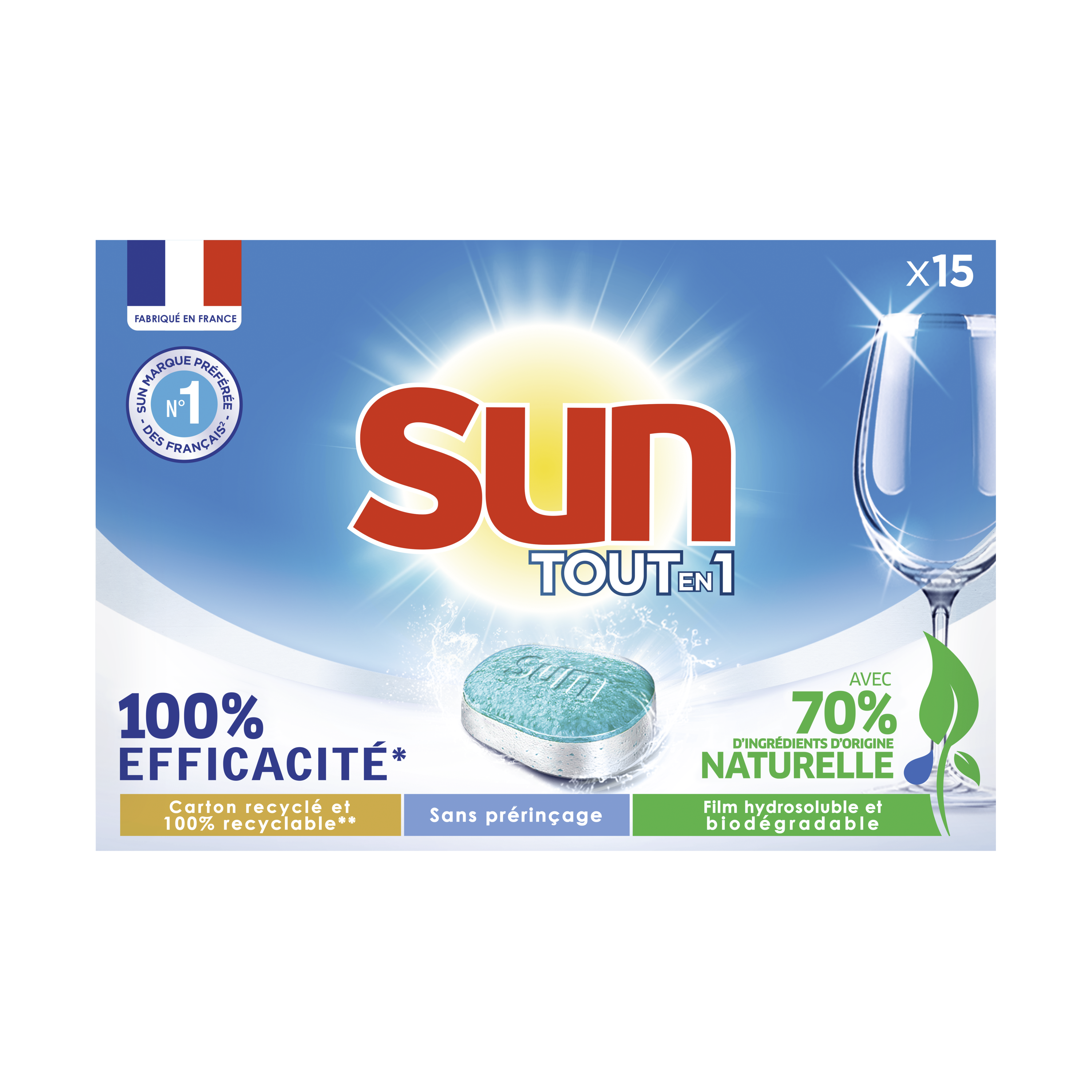 Tablettes Lave-Vaisselle Ne changez rien, Sun change pour vous ! Pas facile de faire les bons gestes pour l’environnement tout en maintenant la même efficacité. Les nouvelles tablettes Sun Tout en 1 garantissent la même performance au lavage, mais avec 70 % d’ingrédients d’origine naturelle. Une solution complète en une seule tablette : la nouvelle formule Sun enlève les taches difficiles et garantit une vaisselle étincelante à chaque lavage, tout en respectant le cahier des charges Ecolabel. Nos tablettes pour lave-vaisselle sont fabriquées en France, dans une usine engagée pour une planète plus verte, notamment à travers le recyclage de tous ses déchets. Elles contiennent zéro phosphates, et sont vendues dans un emballage en carton 100 % recyclable, et fabriqué à partir de carton 90 % recyclé. Pas besoin de pré-rincer : leur action garantit une vraie protection de votre vaisselle, lavage après lavage. Placez la tablette dans le bac à produit, en évitant de la manipuler avec les mains humides. Inutile d'ajouter du sel et du liquide de rinçage : leurs fonctions sont remplies par la formule Tout En 1. Pour une eau très calcaire (>35°fH), il est toutefois recommandé d'ajouter Sun Sel Régénérant. Pour un résultat parfait, nous vous conseillons d'utiliser Sun Nettoyant Machine une fois par mois. Essayez les nouvelles tablettes Sun Tout en 1, 100 % efficaces en 1 seul lavage, maintenant avec 70 % d’ingrédients d’origine naturelle.