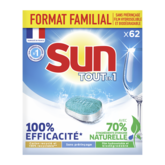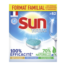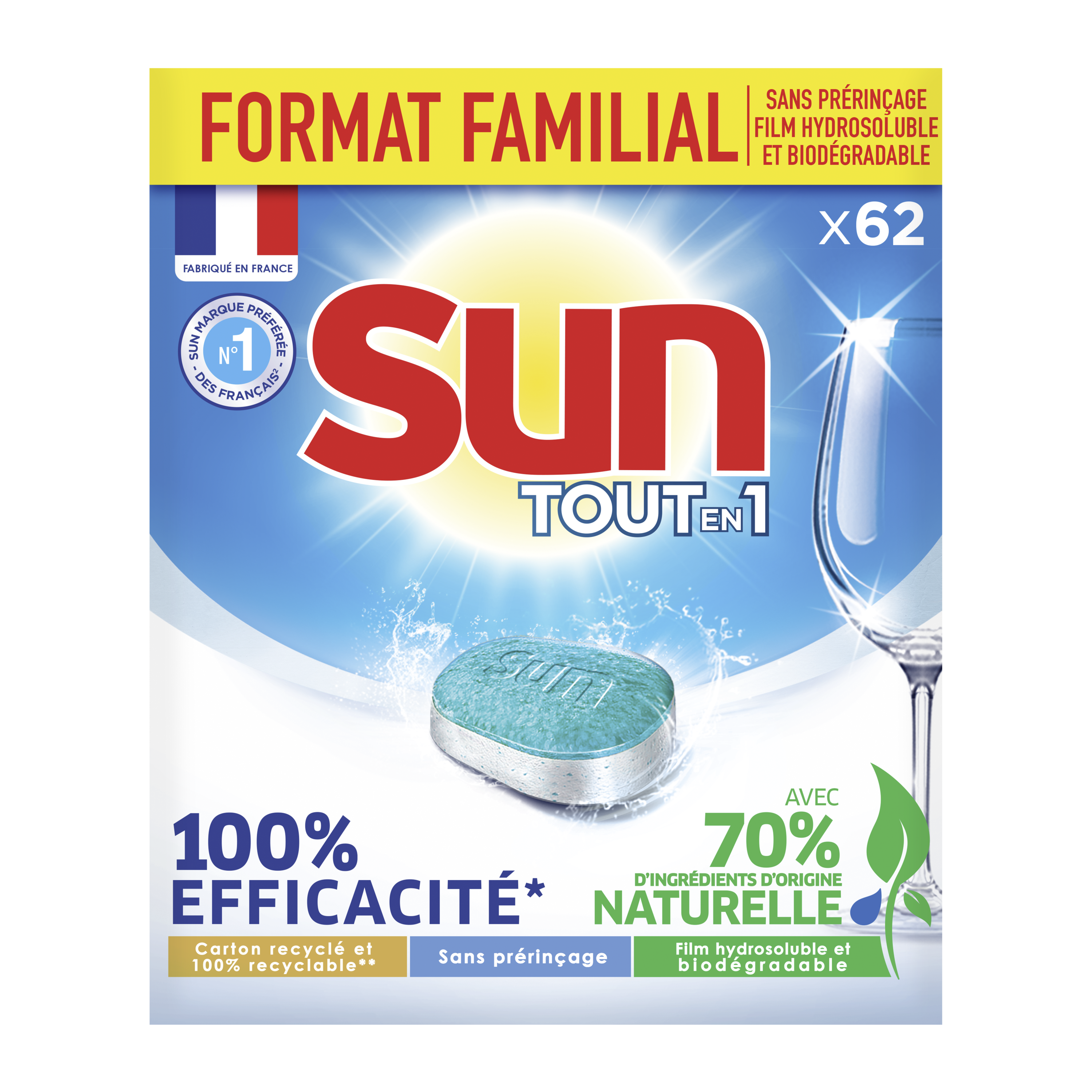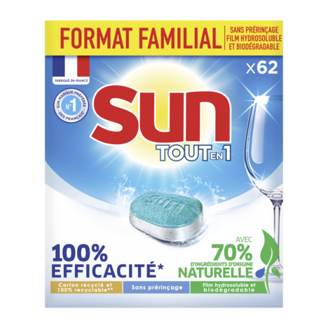 Ne changez rien, Sun change pour vous ! Pas facile de faire les bons gestes pour l’environnement tout en maintenant la même efficacité. Les nouvelles tablettes lave-vaisselle Sun Tout en 1 Ecolabel garantissent la même performance au lavage, mais avec 70 % d’ingrédients d’origine naturelle. Une solution complète en une seule tablette : la nouvelle formule Sun enlève les taches difficiles et garantit une vaisselle étincelante à chaque lavage, tout en respectant le cahier des charges Ecolabel. Nos tablettes pour lave-vaisselle sont fabriquées en France, dans une usine engagée pour une planète plus verte, notamment à travers le recyclage de tous ses déchets. Elles ne contiennent pas de phosphates, et sont vendues dans un emballage en carton 100?% recyclable, et fabriqué à partir de carton 90?% recyclé. Pas besoin de pré-rincer : leur action garantit une vraie protection de votre vaisselle, lavage après lavage. Placez la tablette dans le bac dédié ou directement dans votre machine, en évitant de la manipuler avec les mains humides. Inutile d'ajouter du sel et du liquide de rinçage : leurs fonctions sont remplies par la formule Tout En 1. Pour une eau très calcaire (>35°fH), il est toutefois recommandé d'ajouter Sun Sel Régénérant. Pour un résultat parfait, nous vous conseillons d'utiliser Sun Nettoyant Machine une fois par mois. Essayez les nouvelles tablettes Sun Tout en 1, 100 % efficaces en un seul lavage, maintenant avec 70 % d’ingrédients d’origine naturelle.