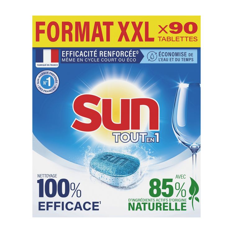 Pas toujours facile de choisir entre efficacité et meilleur respect de l'environnement. Avec Sun, optez pour des produits 100 % efficaces¹ avec 85 % d'ingrédients actifs d'origine naturelle. Une solution complète en une seule tablette : la formule Sun Tout En 1 Regular Ecolabel enlève les taches difficiles et garantit une vaisselle étincelante à chaque lavage, tout en respectant le cahier des charges Ecolabel. TEFAL a réalisé des tests en laboratoire pour comprendre quels détergents lave-vaisselle étaient les plus respectueux de leurs produits, notamment de leurs poêles à induction. Après seulement 50 lavages, avec la plupart des tablettes du marché, on observe une dégradation du fond des poêles. Sauf avec les tablettes Sun Tout en 1 ! Nos pastilles ressortent comme les moins agressives pour les ustensiles de cuisine, notamment les poêles et casseroles compatibles induction, avec un effet notable : des ustensiles qui durent vraiment plus longtemps ! Profitez-en, et gagnez du temps en mettant vos poêles (y compris à induction) au lave-vaisselle sans mauvaise conscience ! Terminé le lavage à la main, Sun s'occupe de tout ! Sun tablette Tout en 1 vous garantit un confort d'utilisation spécialement conçu pour faciliter votre quotidien et assure un résultat impeccable lavage après lavage, même sans pré-rinçage. Ces pastilles lave-vaisselle sont efficaces à basse température, ainsi qu'en cycles éco et court, afin d'économiser de l'eau, du temps et de l'énergie. Grâce à leur formule intégrale, les tablettes lave-vaisselle Sun Tout en 1 permettent une action complète : inutile d'ajouter du sel régénérant ou du liquide de rinçage ! Elles sont contenues dans un sachet hydrosoluble que vous n'avez pas à retirer, pour une utilisation plus pratique. Nos dosettes lave-vaisselle sont fabriquées en France, dans une usine engagée pour une planète plus verte, notamment à travers le recyclage de tous ses déchets. Elles contiennent zéro phosphate, et sont vendues dans un emballage en carton 100 % recyclable et fabriqué à partir de carton à 90 % recyclé. ¹ 100 % de l'efficacité Sun Tout en 1 avec 85% d'ingrédients actifs nettoyants d'origine naturelle. ² Versus formule précédente.