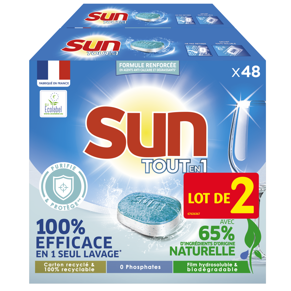 Tablette Lave-vaisselle Depuis plus de 50 ans, Sun innove et améliore régulièrement Les performances de ses produits, tout en contribuant à un mode de vie durable : Vos tablettes Sun sont fabriquées en France, dans une usine engagée pour une planète plus verte, notamment à travers le recyclage de ses déchets. Fort de plus de 50 ans d’expertise et marque N°1* en France, Sun améliore constamment les formules de ses produits lave-vaisselle afin qu’elles fonctionnent à basses températures, en cycle court et vous permettent de faire des économies d’eau et d’énergie. La marque s’implique dans une démarche de développement durable, tous ses emballages en carton sont composés de 85 % de papier recyclé et sont également recyclables et biodégradables**. Les tablettes pour lave-vaisselle Tout en 1 sont fabriquées en France**, dans notre usine à Saint-Vulbas, près de Lyon. Qu’elles soient classiques, tout en 1 ou expert, les tablettes Sun sont fabriquées en France.