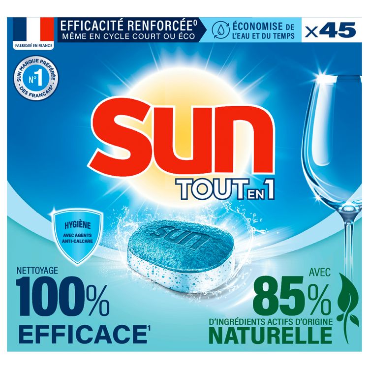 Pas toujours facile de choisir entre efficacité et meilleur respect de l'environnement. Avec Sun, optez pour des produits 100 % efficaces¹ avec 85 % d'ingrédients actifs d'origine naturelle. Une solution complète en une seule tablette : la formule Sun Tout En 1 Purifie et Protège Ecolabel enlève les taches difficiles et garantit une vaisselle étincelante à chaque lavage, tout en respectant le cahier des charges Ecolabel. TEFAL a réalisé des tests en laboratoire pour comprendre quels détergents lave-vaisselle étaient les plus respectueux de leurs produits, notamment de leurs poêles à induction. Après seulement 50 lavages, avec la plupart des tablettes du marché, on observe une dégradation du fond des poêles. Sauf avec les tablettes Sun Tout en 1 ! Nos pastilles ressortent comme les moins agressives pour les ustensiles de cuisine, notamment les poêles et casseroles compatibles induction, avec un effet notable : des ustensiles qui durent vraiment plus longtemps ! Profitez-en, et gagnez du temps en mettant vos poêles (y compris à induction) au lave-vaisselle sans mauvaise conscience ! Terminé le lavage à la main, Sun s'occupe de tout ! Sun tablette Tout en 1 vous garantit un confort d'utilisation spécialement conçu pour faciliter votre quotidien et assure un résultat impeccable lavage après lavage, même sans pré-rinçage. Ces pastilles lave-vaisselle sont efficaces à basse température, ainsi qu'en cycles éco et court, afin d'économiser de l'eau, du temps et de l'énergie. Grâce à leur formule intégrale, les tablettes lave-vaisselle Sun Tout en 1 permettent une action complète : inutile d'ajouter du sel régénérant ou du liquide de rinçage ! Elles sont contenues dans un sachet hydrosoluble que vous n'avez pas à retirer, pour une utilisation plus pratique. Nos dosettes lave-vaisselle sont fabriquées en France, dans une usine engagée pour une planète plus verte, notamment à travers le recyclage de tous ses déchets. Elles contiennent zéro phosphate, et sont vendues dans un emballage en carton 100 % recyclable et fabriqué à partir de carton à 90 % recyclé. ¹ 100 % de l'efficacité Sun Tout en 1 avec 85% d'ingrédients actifs nettoyants d'origine naturelle. ² Versus formule précédente.