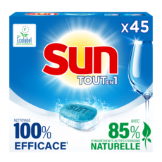 Pas toujours facile de choisir entre efficacité et meilleur respect de l'environnement. Avec Sun, optez pour des produits 100 % efficaces¹ avec 85 % d'ingrédients actifs d'origine naturelle. Une solution complète en une seule tablette : la formule Sun Tout En 1 Regular Ecolabel enlève les taches difficiles et garantit une vaisselle étincelante à chaque lavage, tout en respectant le cahier des charges Ecolabel. TEFAL a réalisé des tests en laboratoire pour comprendre quels détergents lave-vaisselle étaient les plus respectueux de leurs produits, notamment de leurs poêles à induction. Après seulement 50 lavages, avec la plupart des tablettes du marché, on observe une dégradation du fond des poêles. Sauf avec les tablettes Sun Tout en 1 ! Nos pastilles ressortent comme les moins agressives pour les ustensiles de cuisine, notamment les poêles et casseroles compatibles induction, avec un effet notable : des ustensiles qui durent vraiment plus longtemps ! Profitez-en, et gagnez du temps en mettant vos poêles (y compris à induction) au lave-vaisselle sans mauvaise conscience ! Terminé le lavage à la main, Sun s'occupe de tout ! Sun tablette Tout en 1 vous garantit un confort d'utilisation spécialement conçu pour faciliter votre quotidien et assure un résultat impeccable lavage après lavage, même sans pré-rinçage. Ces pastilles lave-vaisselle sont efficaces à basse température, ainsi qu'en cycles éco et court, afin d'économiser de l'eau, du temps et de l'énergie. Grâce à leur formule intégrale, les tablettes lave-vaisselle Sun Tout en 1 permettent une action complète : inutile d'ajouter du sel régénérant ou du liquide de rinçage ! Elles sont contenues dans un sachet hydrosoluble que vous n'avez pas à retirer, pour une utilisation plus pratique. Nos dosettes lave-vaisselle sont fabriquées en France, dans une usine engagée pour une planète plus verte, notamment à travers le recyclage de tous ses déchets. Elles contiennent zéro phosphate, et sont vendues dans un emballage en carton 100 % recyclable et fabriqué à partir de carton à 90 % recyclé. ¹ 100 % de l'efficacité Sun Tout en 1 avec 85% d'ingrédients actifs nettoyants d'origine naturelle. ² Versus formule précédente.