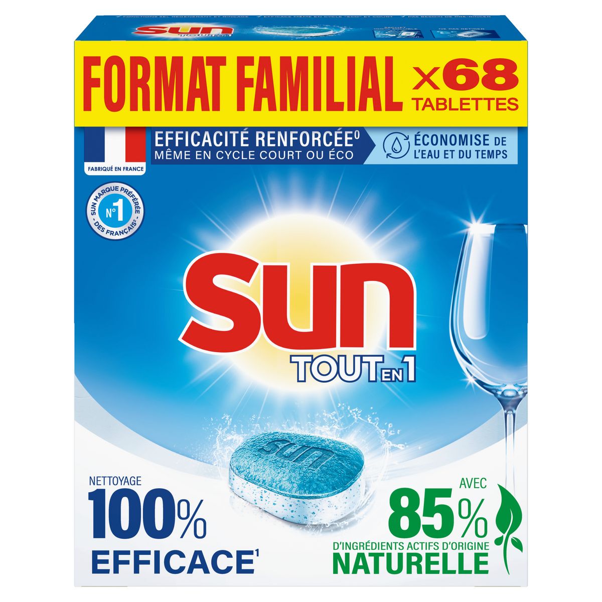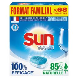 Sun tablette Tout en 1 vous garantit un confort d'utilisation spécialement conçu pour faciliter votre quotidien et assure un résultat impeccable lavage après lavage, même sans pré-rinçage. Ces pastilles lave-vaisselle sont efficaces à basse température, ainsi qu'en cycles éco et court, afin d'économiser de l'eau, du temps et de l'énergie. Grâce à leur formule intégrale, les tablettes lave-vaisselle Sun Tout en 1 permettent une action complète : inutile d'ajouter du sel régénérant ou du liquide de rinçage ! Elles sont contenues dans un sachet hydrosoluble que vous n'avez pas à retirer, pour une utilisation plus pratique. Nos dosettes lave-vaisselle sont fabriquées en France, dans une usine engagée pour une planète plus verte, notamment à travers le recyclage de tous ses déchets. Elles contiennent zéro phosphate, et sont vendues dans un emballage en carton 100 % recyclable et fabriqué à partir de carton à 90 % recyclé.