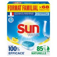 Sun tablette Tout en 1 vous garantit un confort d'utilisation spécialement conçu pour faciliter votre quotidien et assure un résultat impeccable lavage après lavage, même sans pré-rinçage. Ces pastilles lave-vaisselle sont efficaces à basse température, ainsi qu'en cycles éco et court, afin d'économiser de l'eau, du temps et de l'énergie. Grâce à leur formule intégrale, les tablettes lave-vaisselle Sun Tout en 1 permettent une action complète : inutile d'ajouter du sel régénérant ou du liquide de rinçage ! Elles sont contenues dans un sachet hydrosoluble que vous n'avez pas à retirer, pour une utilisation plus pratique. Nos dosettes lave-vaisselle sont fabriquées en France, dans une usine engagée pour une planète plus verte, notamment à travers le recyclage de tous ses déchets. Elles contiennent zéro phosphate, et sont vendues dans un emballage en carton 100 % recyclable et fabriqué à partir de carton à 90 % recyclé.