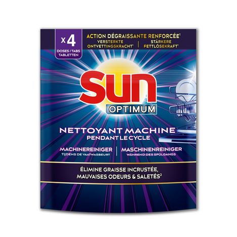Pour un résultat optimal et un entretien parfait, nous vous recommandons d'utiliser Sun Optimum Nettoyant Machine pendant le cycle une fois par mois. En achetant ce produit lave-vaisselle, profitez de 4 mois d'entretien maximisé pour votre machine lave-vaisselle. Remplissez votre lave-vaisselle. Mettez le nettoyant machine Sun à n'importe quel endroit de votre lave-vaisselle. Utilisez votre détergent habituel puis lancez un cycle de lavage ordinaire.