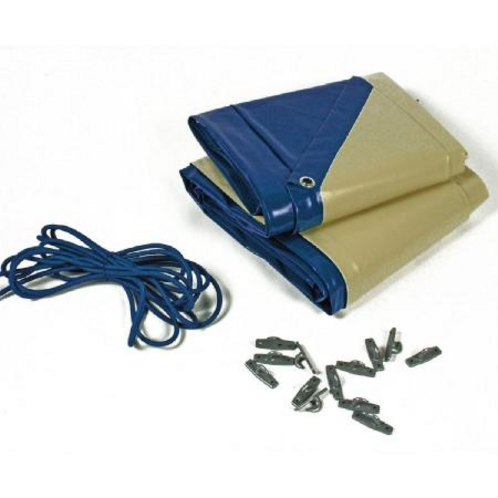 550g/m² bordée en périphérie avec oeillets, sandow et crochets de fixation. Recouvre les margelles et se fixe à l'aide d'un sandow. Coloris bleu/beige. Evacuation des eaux fluides.