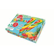 Eau, purée de jus de fruit 20% (jus d'orange 15%, purée de fraise 2%, purée d'ananas 1%, jus de pomme 1%, jus de citron 1%), sucre, sirop de glucose, dextrose, acide citrique, arômes naturels, stabilisant (gomme de guar), colorants (caroténoïde, complexes cuivre-chlorophylles et cuivre- chlorophyllines, riboflavine) jus de betterave rouge.