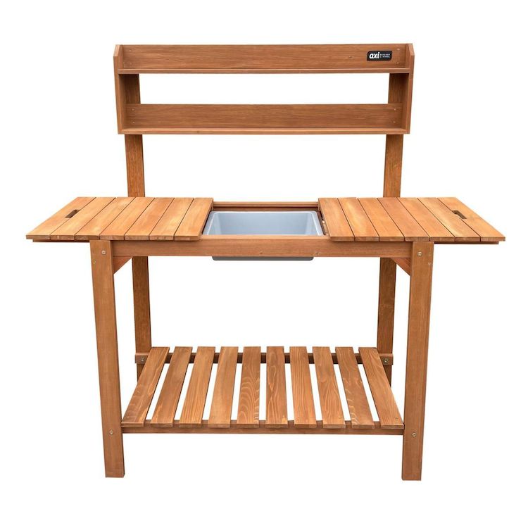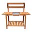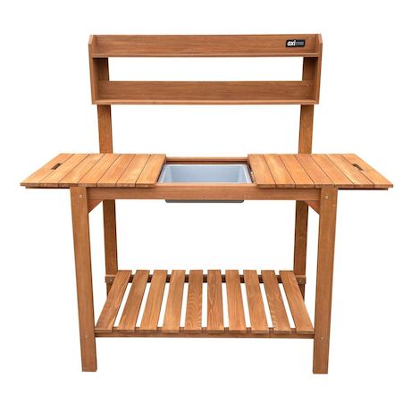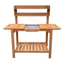 Contient : Table rempotage plateau coulissant Caractéristiques Rempotez vos plantes sans effort grâce à cette table de rempotage pratique. Plan de travail coulissant. Bac de rangement en plastique d'une capacité d'environ 10 L. Hauteur de travail ergonomique pour tous les jardiniers. Idéal pour un jardin ou un balcon. Plan de travail coulissant en bois. Étagère de rangement en dessous pour les plantes, le terreau et les pots. Deux niveaux supplémentaires pour les outils ou les plantes. Deux crochets pour suspendre un râteau ou une truelle. Naturellement résistant aux intempéries. Traitement avec une teinture à base d'eau, sans produits chimiques. Dimensions (L x l x H) : 100,5 x 46 x 140,5 cm. Hauteur de travail : 84 cm. Dimensions du plan de travail fermé (L x l) : 100,5 x 46 cm. Épaisseur du plan de travail : 1,5 cm.