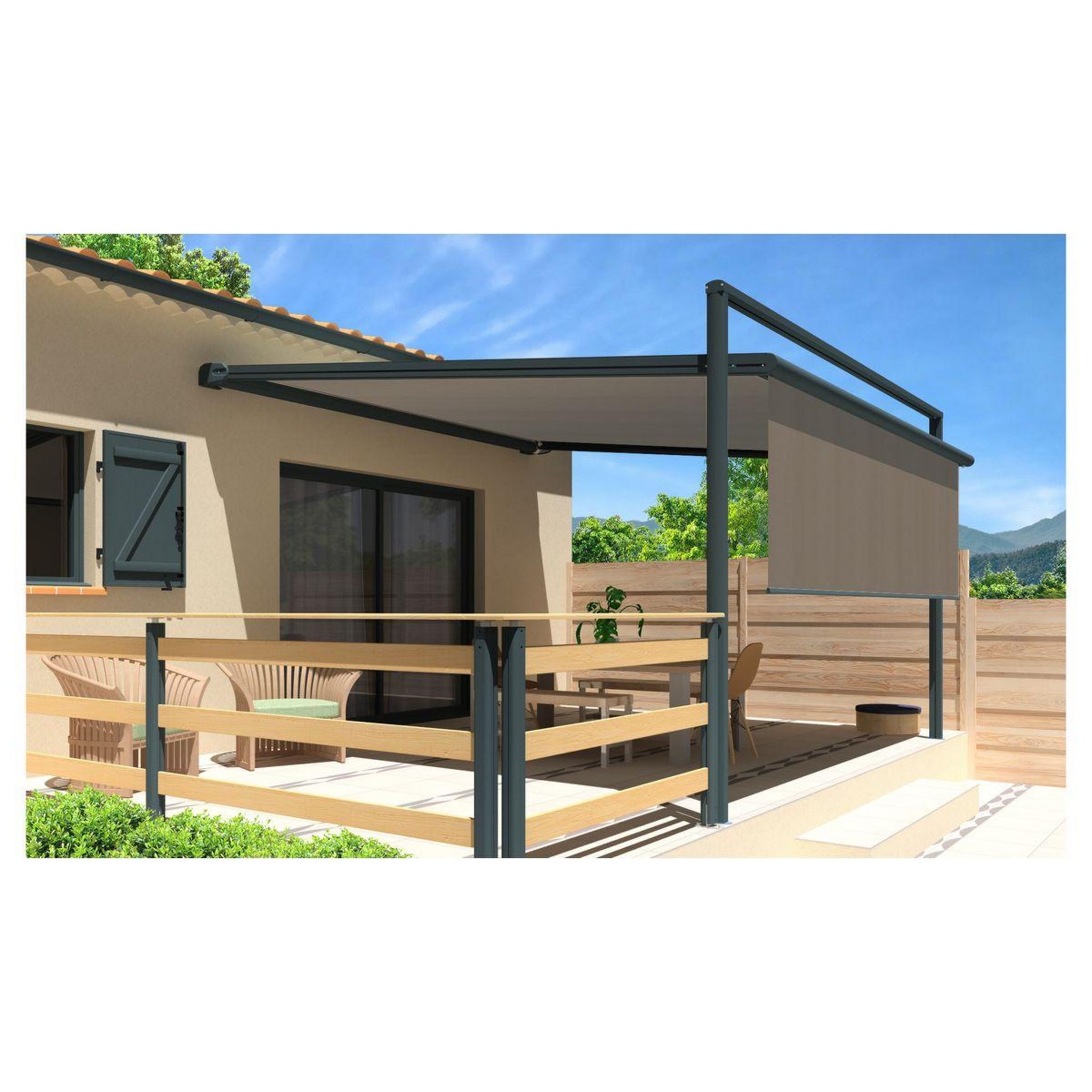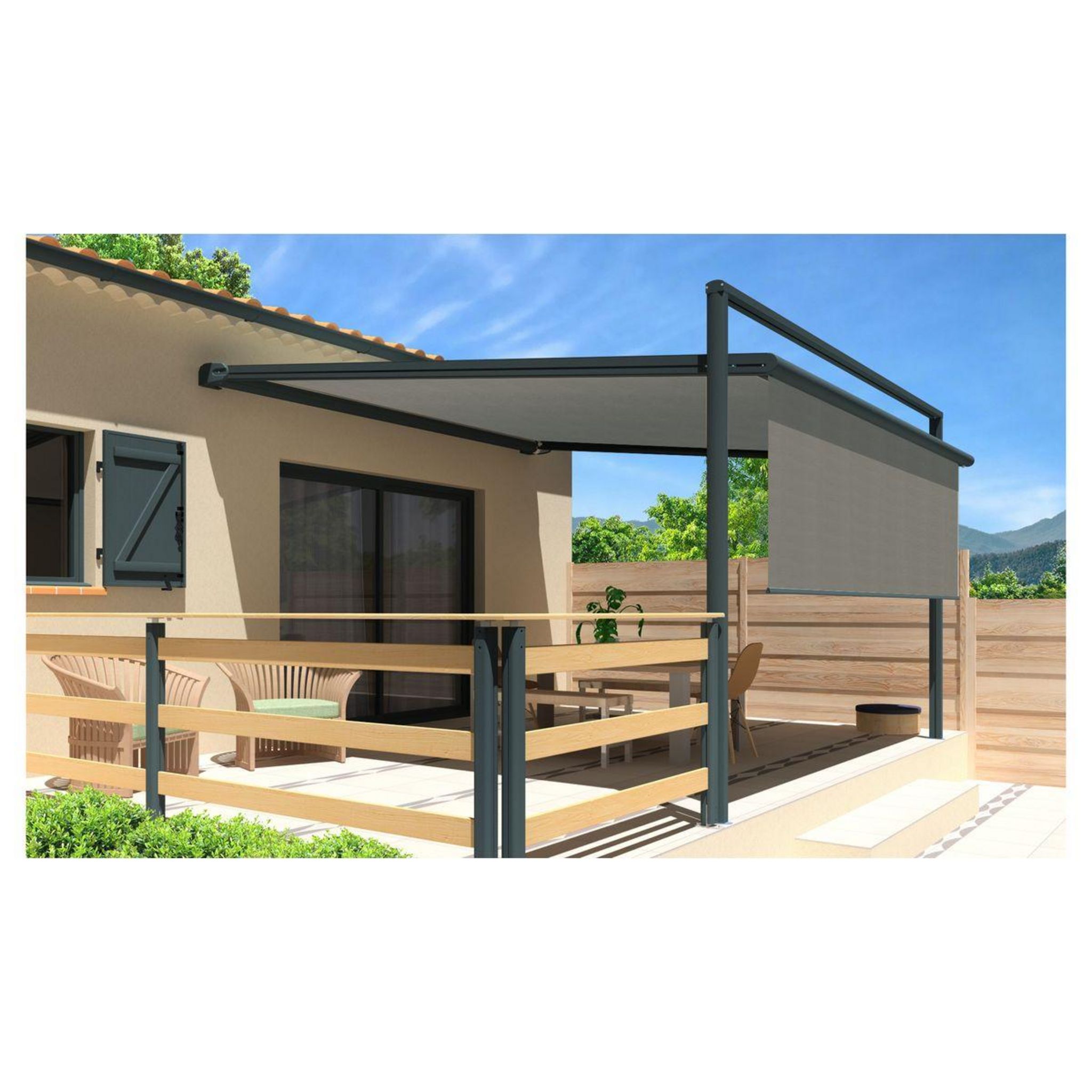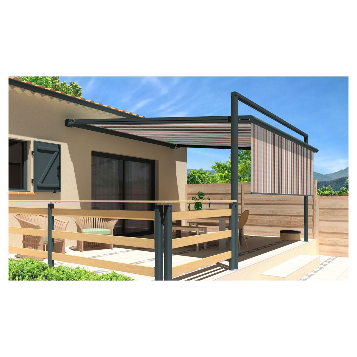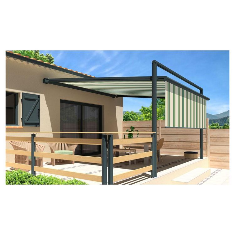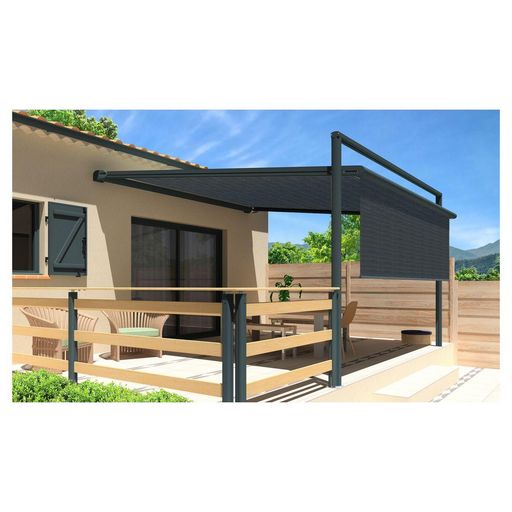La pergola toile MELODIE est un compromis entre un store et une pergola rigide. La toile est guidée ce qui lui procure une ouverture comme un store. Rapide à déployer et résistante au vent grâce à sa structure en aluminium laquée grise anthracite, cette pergola store MELODIE a tout pour plaire ! Cette pergola MELODIE est également composée d'un lambrequin droit assorti à la toile de la pergola, pour vous apporter encore plus d'ombre si vous le souhaitez. Motorisé avec télécommande et manœuvre de secours, cette pergola store MELODIE 3x3x1.5m de fabrication française trouvera sa place sur votre terrasse.
