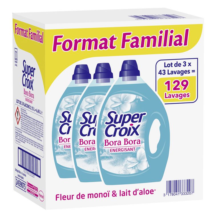 Vivez une expérience sensorielle unique avec Super Croix. En plus de vous assurer une propreté impeccable dès 30°, la lessive parfumée Super Croix offre à votre linge un parfum d’évasion intense. Super Croix est allé puiser au cœur de ses destinations, des parfums délicats et raffinés pour des sensations irrésistibles. Découvrez la lessive Super Croix Bora Bora et laissez-vous emporter par son parfum intense, longue durée et dépaysant. Son parfum doux et exotique,fleur de monoï et lait d’amande d'aloe* offre à votre linge un vrai moment d'évasion à chaque lavage ! Parfum de synthèse. Manipuler avec des mains sèches. Tenir hors de portée des enfants. Super Croix Bora Bora 2,15L