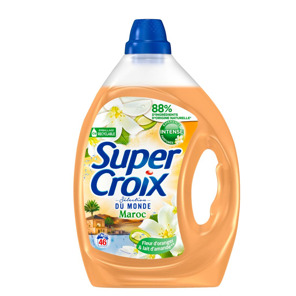 Vivez une expérience sensorielle unique avec Super Croix. En plus de vous assurer une propreté impeccable dès 20°C, la lessive parfumée Super Croix, composée à 88% d'ingrédients d'origine naturelle*, offre à votre linge un parfum d'évasion intense. Super Croix est allé puiser au cœur de ses destinations, des parfums délicats et raffinés pour des sensations irrésistibles. Découvrez la lessive Super Croix Maroc et laissez-vous emporter par son parfum intense, longue durée et dépaysant. Son parfum doux et exotique fleur d'oranger** offre à votre linge un vrai moment d'évasion à chaque lavage !