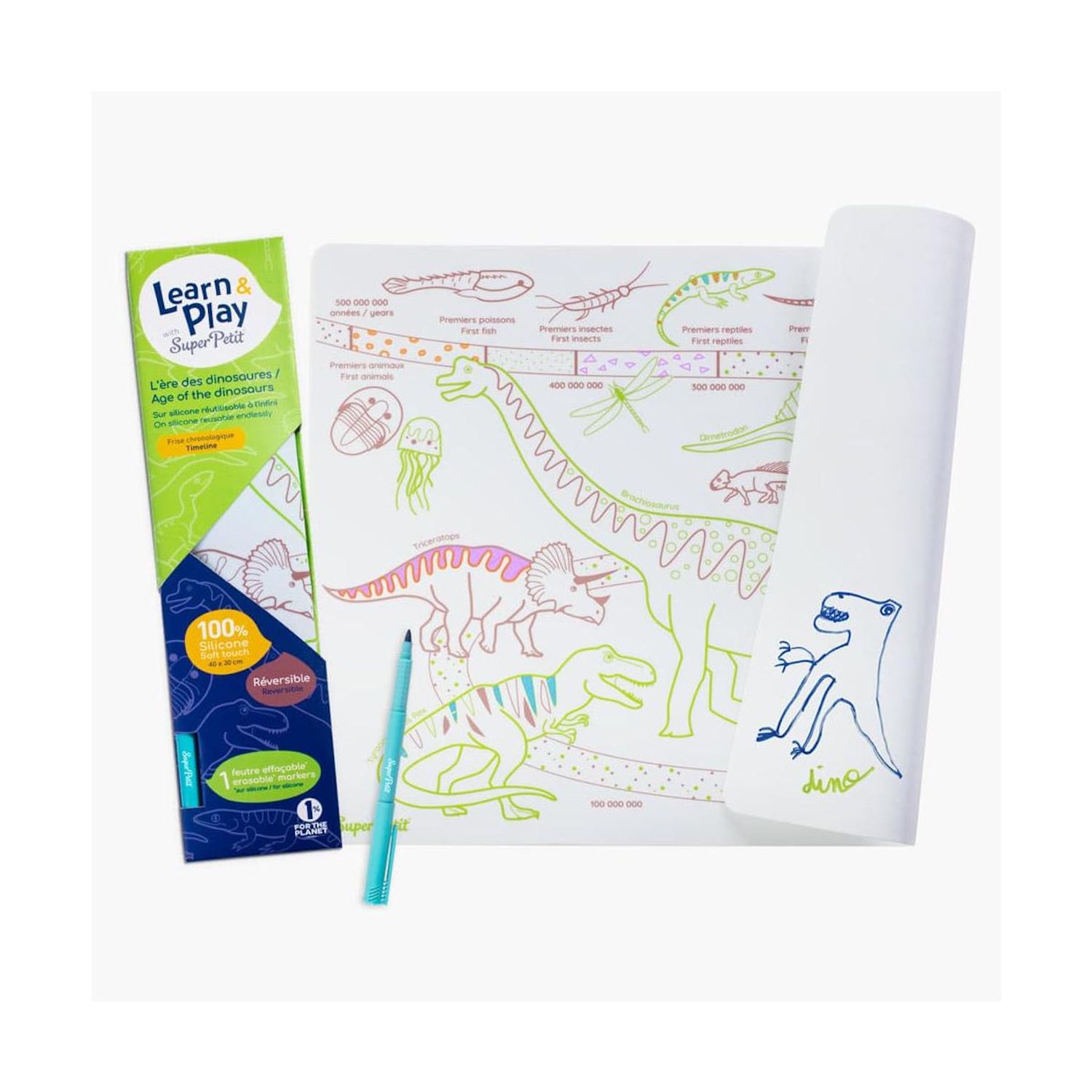 À découvrir absolument ce set ludique et pédagogique en silicone tout doux sur l'apparition de la vie à la disparition des dinosaures! Cette frise chronologique ludique permet à l'enfant d'apprendre la vie et l'évolution des dinosaures jusqu'à leur extinction. Sous chaque nom de dinosaures, on peut lire leur periode de vie. Sur cette frise, on y rencontre des dinosaures connus ( tyrannosaur, triceratops.) mais on y découvre aussi d'autres animaux. 1 set en silicone réversible: 1 côté coloriage pédagogique + 1 côté dessin libre + 1 feutre inclus