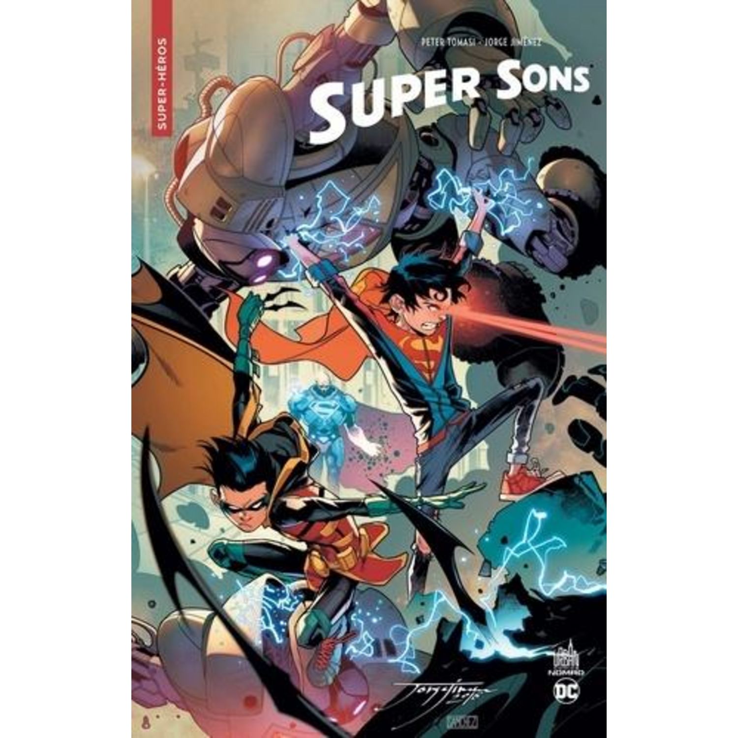 Si Jon Kent est le fils du plus grand super-héros, Damian Wayne est celui du plus dangereux. Et malgré l'amitié que se portent les deux membres de la Ligue de Justice Superman et Batman, leur progéniture, elle, a plus de mal à s'entendre. La menace de Kid Amazo va cependant lier à jamais les deux jeunes héros, Superboy et Robin, dans un tandem destiné à reprendre le flambeau de leurs parents ! Super sons, ou la réunion d'une nouvelle génération de héros héritiers des plus grands justiciers de l'Univers DC. Peter J. Tomasi poursuit son travail scénaristique sur les relations tumultueuses entre les deux jeunes garçons débutée dans les pages de Superman Rebirth, ainsi que sur l'héritage légendaire dont ils sont les détenteurs. Au dessin, Jorge Jimenez explose comme le nouvel artiste à suivre : un trait percutant servi par une narration limpide et dynamique.