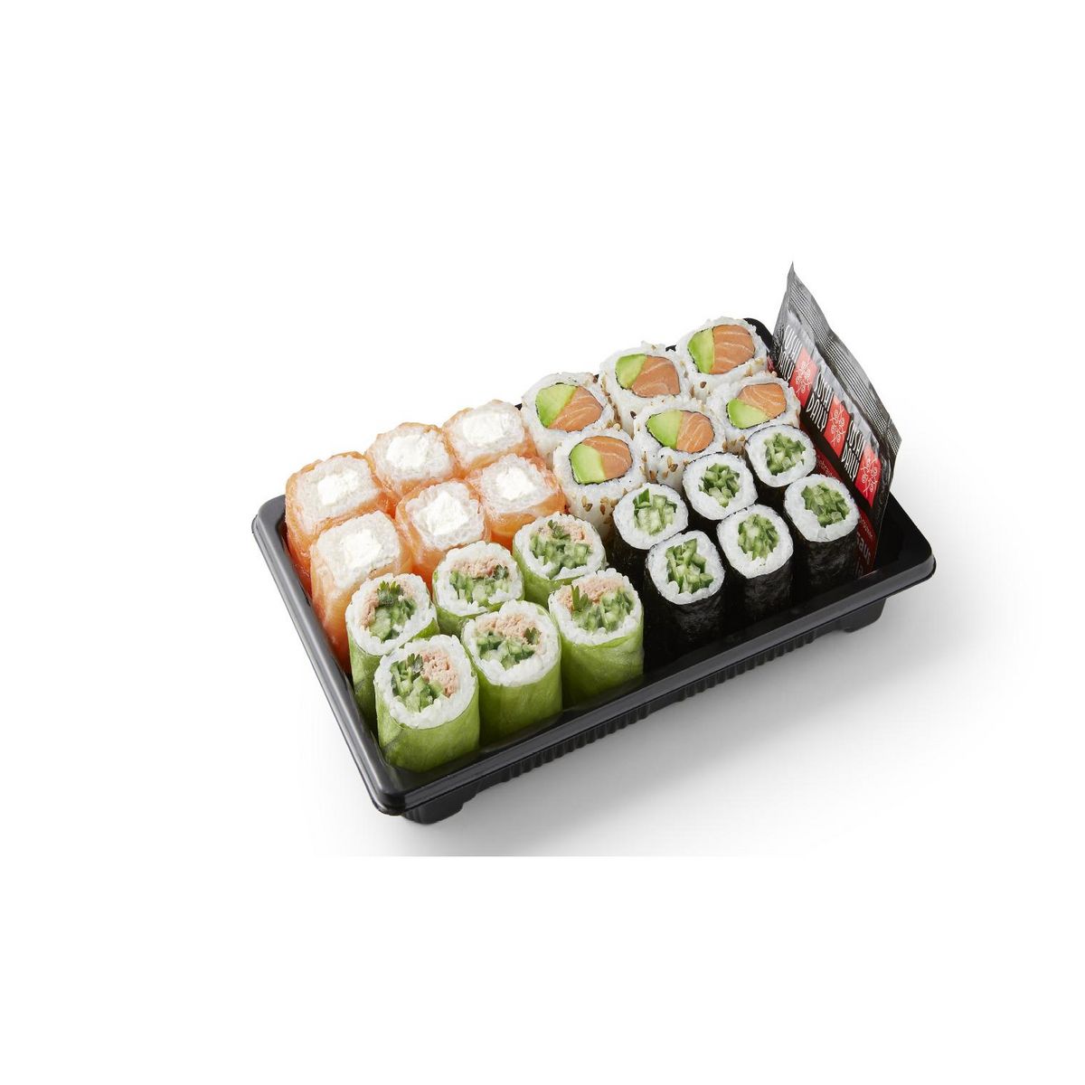 riz vinaigré [riz, eau, vinaigre à sushi [vinaigre distillé, vinaigre de riz, sucre, sel, sirop de maïs riche en fructose, colorant : E150b (sulfites ), eau, extrait de kelp, dextrose, saké (kôji, aspergillus oryzae, eau, riz), vinaigre d'alcool, sirop de maïs], jus de citron, huile de tournesol, sel], saumon (Salmo Salar) ( poisson ), concombre, avocat, préparation fromagère [lait , stabilisant : E412, Babeurre (lait ), crème pasteurisée ( lait ), ferments lactiques (lait ), épaississants : E407, E410, produit de lactosérum ( lait ), conservateur : E200, correcteur d'acidité : E330, fromage frais ( lait ), sel, crème ( lait) , Extraits secs laitiers ( lait) , protéines de lait, lait pasteurisé], thon cuit [thon (thunnus albacares ) ( poisson ), thon ( poisson ), thon listao ( poisson ), eau, sel], feuille de riz [amidon de tapioca, farine de tapioca, farine de riz, eau, riz, sel], mayonnaise [huile de colza, jaune d' œufs (jaune d' œufs , sel, sirop de glucose), jaunes d' œufs pasteurisés, jus de citron (conservateur : E224 ( sulfites )), vinaigre de riz, sauce soja tamari, sucre, sel, moutarde (sel, vinaigre, curcuma, graines de moutarde ), poudre d'ail, vinaigre d'alcool, épaississants : E412, E415, amidon modifié, vinaigre, vinaigre d'alcool, sirop de glucose-fructose, épices, graines de moutarde , sauce soja (blé , sel, soja ), dextrose, conservateur : E385, exhausteur de goût : E621, stabilisant : E415, eau], laitue, sésame blanc, algues, coriandre, menthe. Peut contenir: céleri, mollusque, crustacés, fruits à coque, arachide