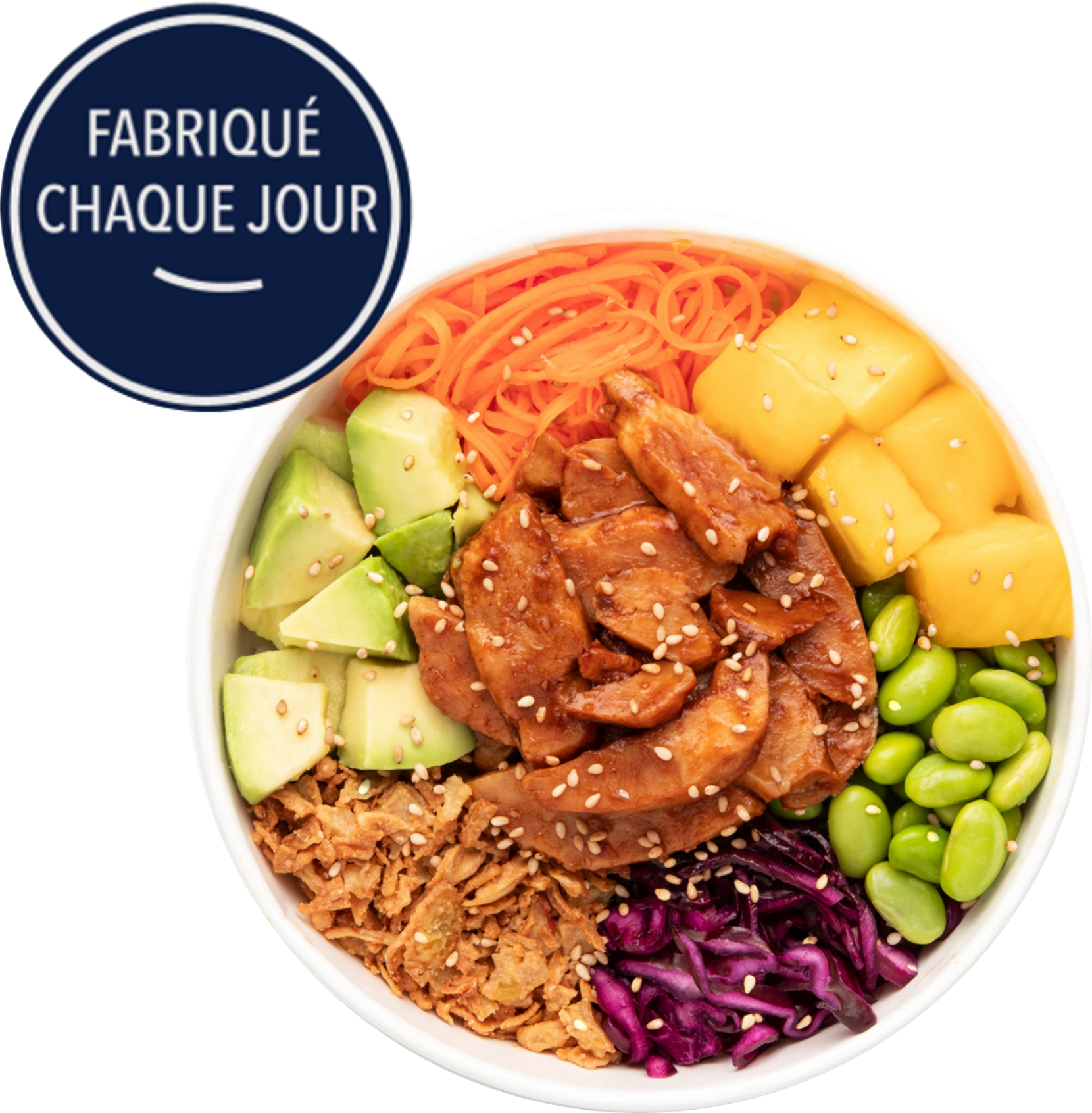 riz vinaigré [riz, vinaigre à sushi [vinaigre distillé, vinaigre de riz, sucre, sel, sirop de maïs riche en fructose, colorant : E150b ( sulfites ), eau, extrait de kelp, dextrose, saké (kôji, aspergillus oryzae, eau, riz), vinaigre d'alcool, sirop de maïs], jus de citron, huile de tournesol, sel], filet de poulet rôti cuit 14,6% [filet de poulet, blanc de poulet, huile de colza, sel, cassonade, poivre noir, poulet, dextrose, huile de tournesol, stabilisant : E451, fécule de pomme de terre, marinade (protéines de soja , amidon de maïs modifié, gélifiant : E407, animal proteins (pork), sel, correcteur d'acidité : E339)], avocat, carotte marinée [carotte, vinaigre à sushi ( sulfites) ], edamame [edamame ( soja ), sel], mangue, sauce sushi [sucre, sauce soja (eau, blé, soja , vinaigre d'alcool, sel, conservateur : E211), eau-de-vie de marc, sel, dashi (bouillon de poisson, mirin), sirop de sucre caramélisé, sirop de glucose-fructose, stabilisants : E415, E401, extrait de levure, amidon modifié, mélasse, caramel aromatique (saccharose, sirop de glucose), mélasses de canne, amidon de maïs modifié, poudre d'algue, eau, alcool éthylique], chou rouge mariné [chou rouge, vinaigre à sushi ( sulfites ), jus de citron, sel], oignons frits [oignon, farine de sarrasin, huile de palme, farine de froment (céréales contenant du gluten ), amidon de riz, sel], sauce soja [soja , alcool, colorant : E150c, eau, conservateur : E202, sel, protéine de soja, blé ], huile de sésame, sésame blanc. Peut contenir: œuf, céleri, mollusque, moutarde, crustacés, fruits à coque, lait, arachide