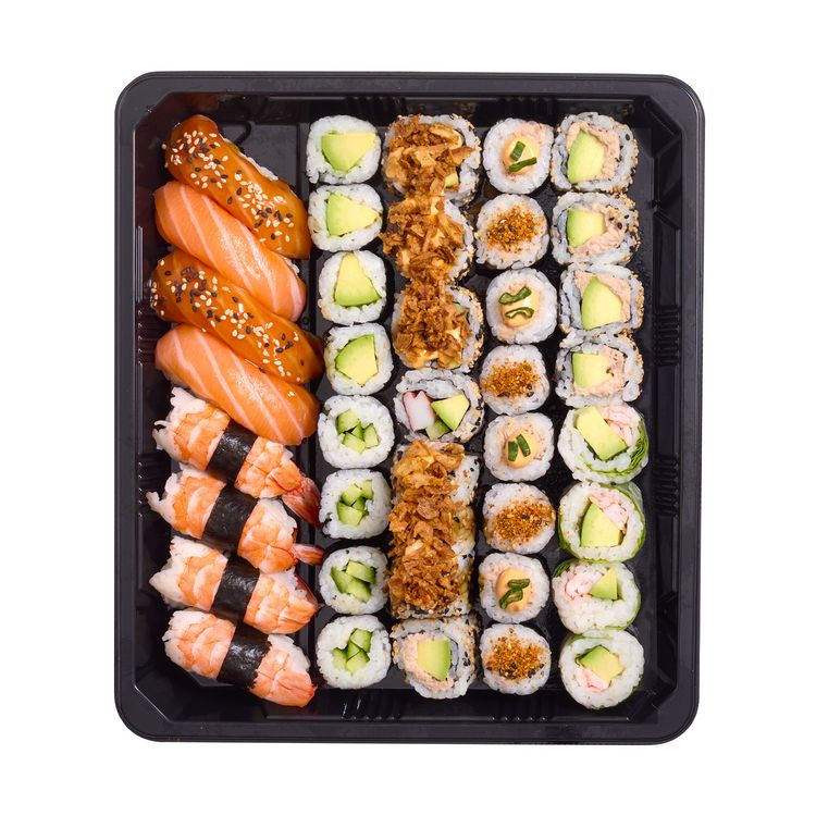 BOX BLACK FRIDAY : 2 sushi saumon, 4 sushi crevette, 2 sushi saumon laqué sésame, 4 california thon cuit mayonnaise épicée oignons frits, 4 california surimi oignons frits, 4 california thon cuit mayonnaise, 4 cristal crevette, 8 maki thon cuit mayonnaise épicée, 4 maki avocat, 4 maki concombre